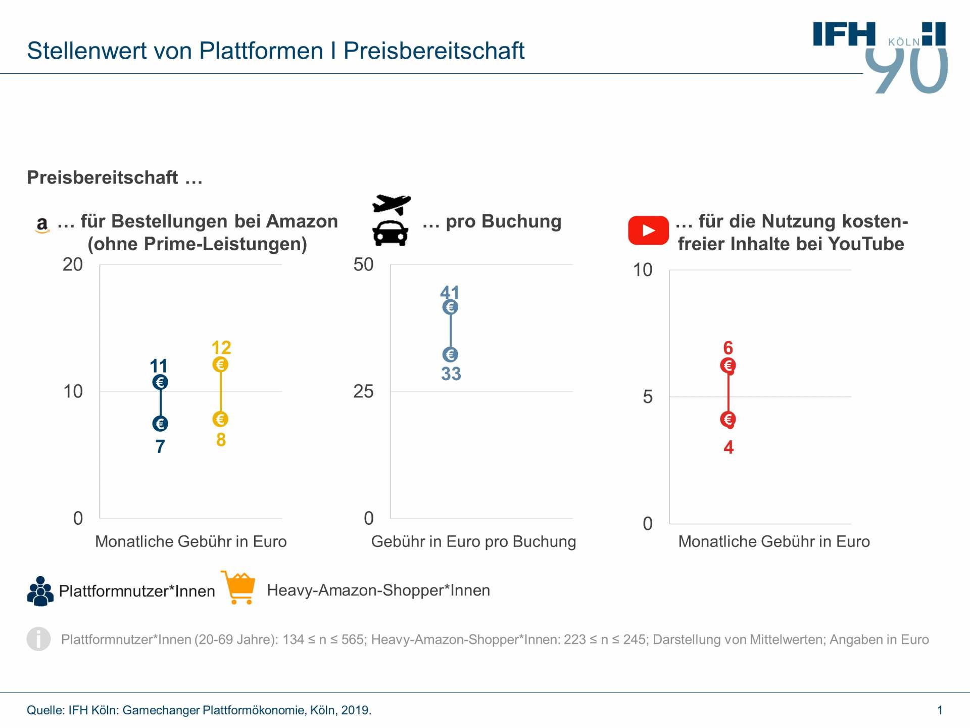 Die Studie „Gamechanger Plattformökonomie –Verhaltensänderungen verstehen und Spielregeln bedienen“ unterstreicht, wie hoch der Stellenwert von Plattformen im Konsument*Innenalltag ist. So zeigt sich u. a., dass Konsument*Innen bereit sind, allein für die grundlegende Nutzung von Plattformen zu bezahlen. So gaben die Befragten an, dass sie zwischen sieben und elf Euro monatlich bezahlen würden, um bei Amazon bestellen zu können – und dass, ohne weitere Prime-Leistungen zu erhalten. Auch YouTube-NutzerInnen würden monatlich ein „Eintrittsgeld“ zahlen, um die bisher kostenfreien Inhalte der Videoplattform abrufen zu können. Am höchsten fällt die Preisbereitschaft für die Nutzung von Flug- oder Mietwagenplattformen aus. Bis zu 41 Euro würden NutzerInnen hierfür je Buchung in die Hand nehmen.