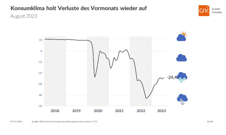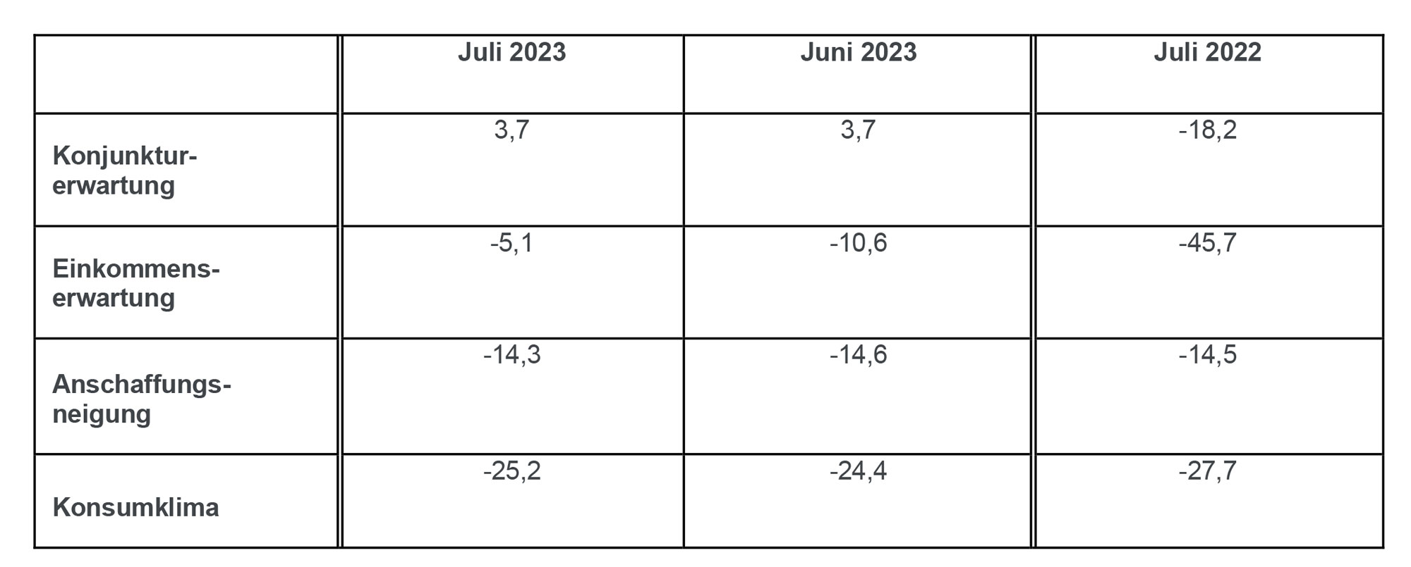 Nach dem leichten Rückgang im Vormonat stabilisiert sich die Verbraucherstimmung im Juli wieder. Die Einkommensaussichten legen moderat zu, während die Konjunkturerwartung und die Anschaffungsneigung nahezu unverändert gegenüber Juni sind. GfK prognostiziert für das Konsumklima im August -24,4 Punkte und damit 0,8 Punkte mehr als im Juli dieses Jahres (revidiert -25,2 Punkte). Dies sind Ergebnisse der GfK Konsumklimastudie für Juli 2023.