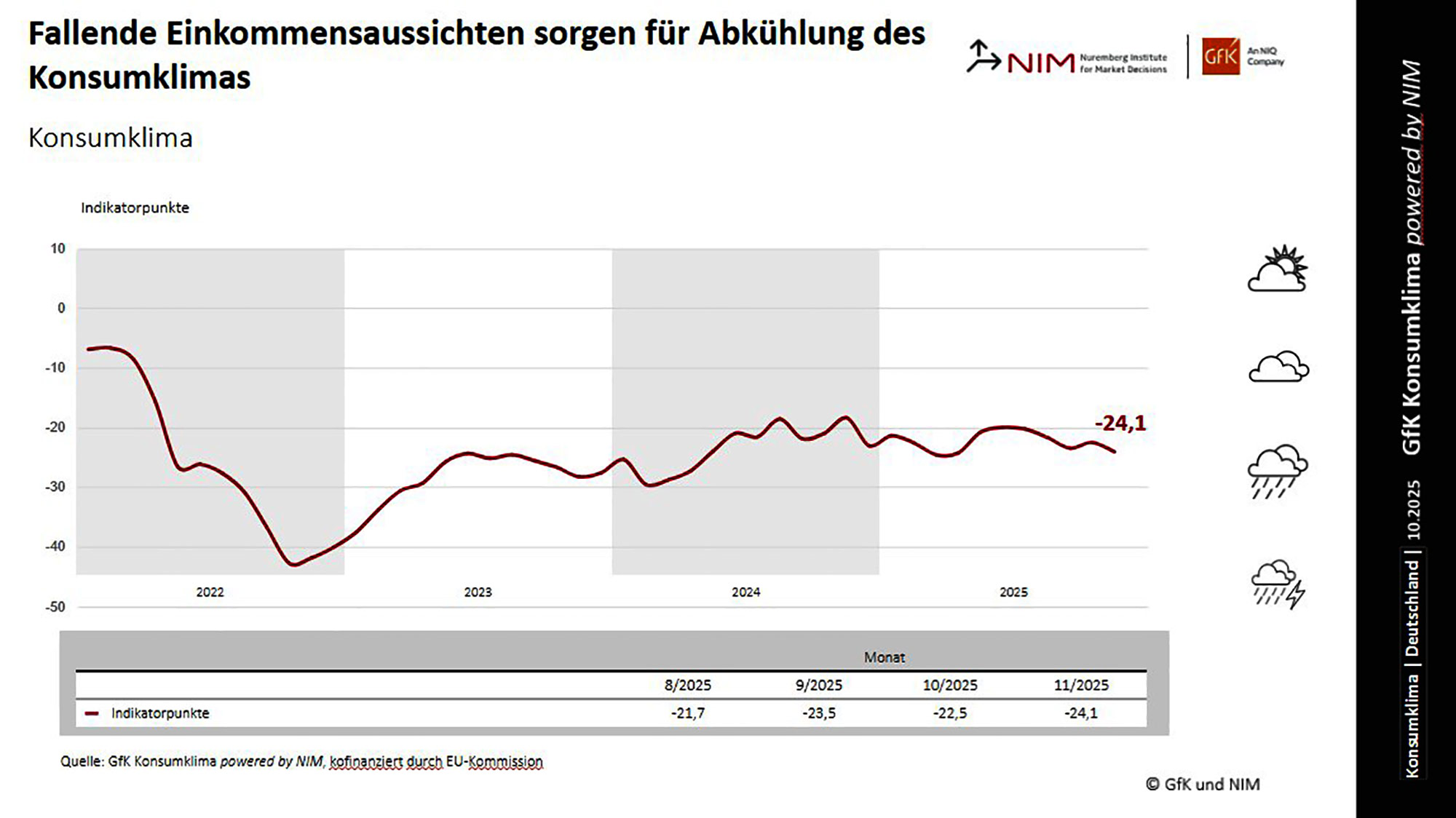 Der stärkste Einflussfaktor auf den Rückgang des Konsumklimas ist die deutlich verschlechterte Einkommenserwartung. Sie verliert im Oktober 12,9 Punkte und sinkt damit auf 2,3 Zähler. Das ist der niedrigste Stand seit März 2025. Damals hatte der Indikator bei -3,1 Punkten gelegen.