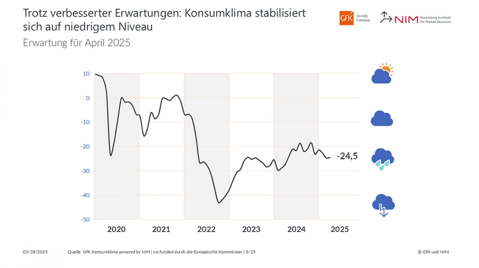 In der ersten Erhebung nach den Neuwahlen zum Deutschen Bundestag erholt sich die Verbraucherstimmung etwas: Sowohl die Konjunktur- wie auch die Einkommenserwartungen und die Anschaffungsneigung verbessern sich. Da jedoch auch die Sparneigung in diesem Monat zunimmt, bleibt das Konsumklima nahezu unverändert. Die Verbraucher erwarten für April 2025 im Vergleich zum Vormonat (revidiert -24,6 Zähler) einen minimalen Anstieg von 0,1 Zähler auf -24,5 Punkte. Dies zeigen die aktuellen Ergebnisse des GfK Konsumklimas powered by NIM. Es wird seit Oktober 2023 gemeinsam von GfK und dem Nürnberg Institut für Marktentscheidungen (NIM), Gründer der GfK, herausgegeben.