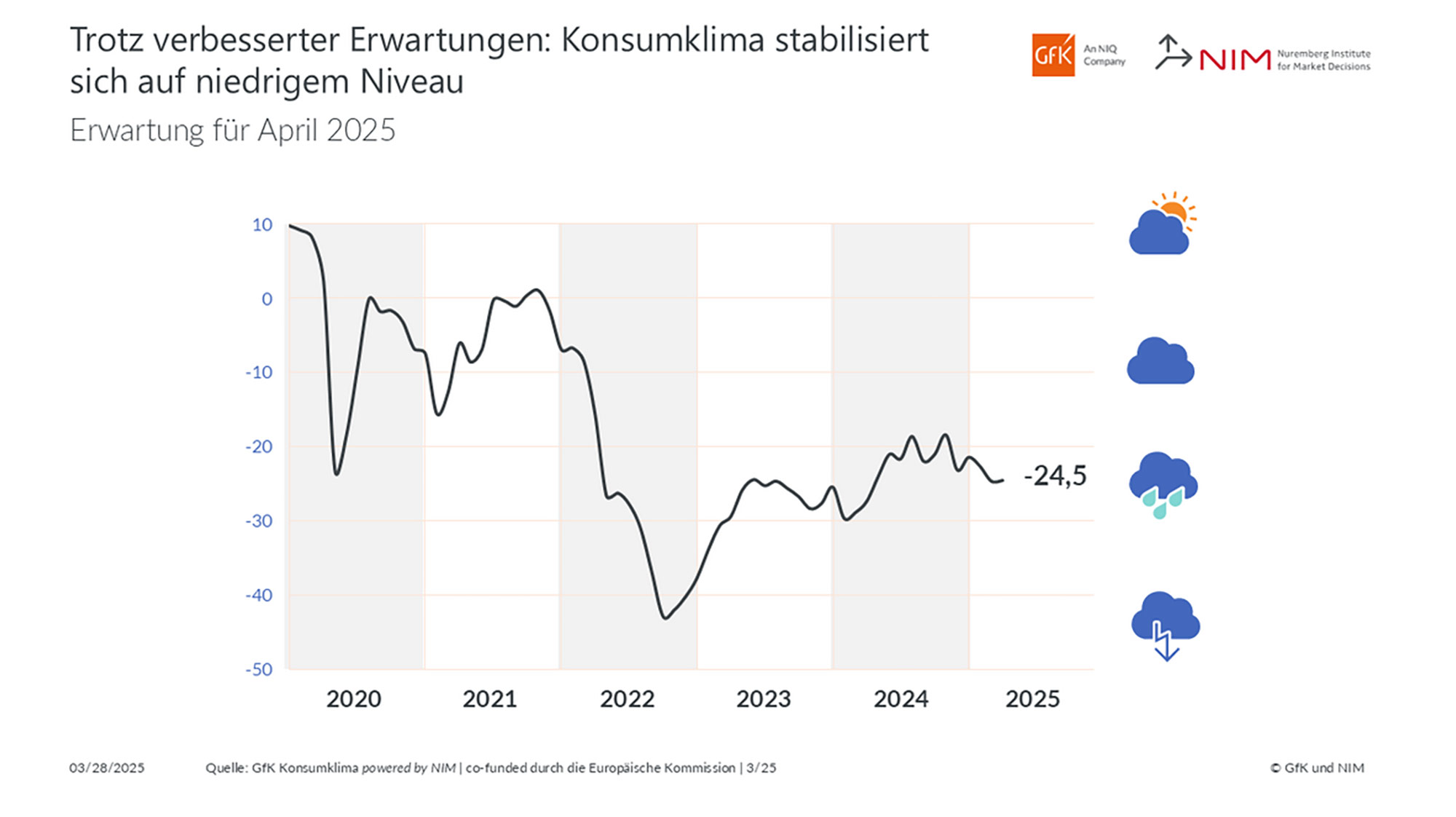 „Ob damit der seit Mitte 2024 herrschende Abwärtstrend gestoppt ist, und eine Erholung der Einkommensstimmung einsetzen kann, bleibt abzuwarten. Als Gründe für die schwache Entwicklung der Einkommenserwartung werden in unseren tiefergehenden Analysen neben den hohen Preisen und ungenügenden Einkommen auch die anhaltend unsichere politische und wirtschaftliche Lage genannt“, ergänzt Rolf Bürkl.