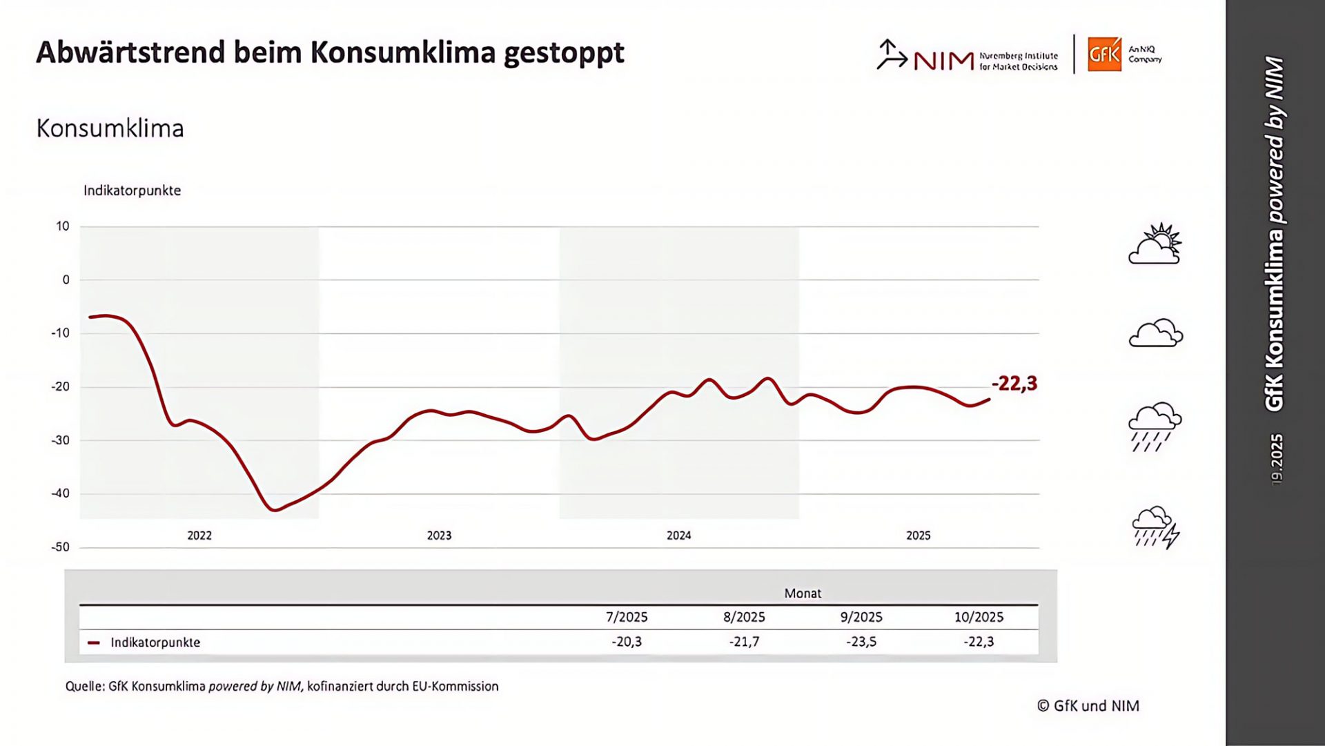 Nach drei Monaten Rückgang zeigt der Konsumklimaindikator im September 2025 erstmals wieder eine Aufwärtsbewegung. Die aktuelle Analyse des GfK Konsumklimas powered by NIM verzeichnet für Oktober 2025 einen Anstieg um 1,2 Punkte auf nun -22,3 Zähler. Entscheidend für diese Entwicklung ist eine spürbare Verbesserung der Einkommenserwartungen. Dagegen sinken sowohl die Konjunkturerwartungen als auch die Anschaffungsneigung weiter. Die Sparneigung bleibt nahezu unverändert.