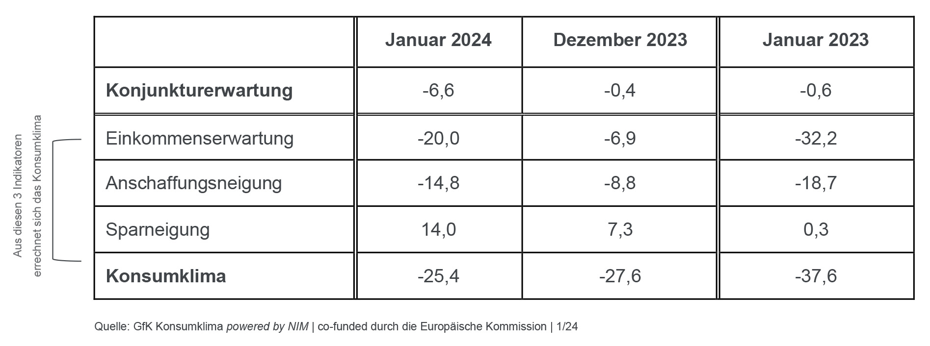 Seit Oktober 2023 wird es gemeinsam von GfK und dem Nürnberg Institut für Marktentscheidungen (NIM), Gründer der GfK, herausgegeben. Der Rückgang der Verbraucherstimmung fällt auch deshalb so stark aus, weil die Sparneigung zu Jahresbeginn spürbar angestiegen ist. Ein schlechterer Wert für das Konsumklima wurde zuletzt im März 2023 mit -30,6 Zählern gemessen.