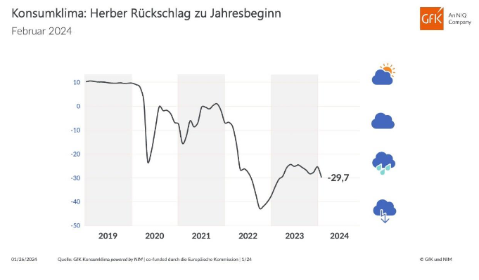 Das Jahr 2024 startet für die Verbraucherstimmung in Deutschland sehr enttäuschend: Sowohl die Konjunktur- und Einkommenserwartung als auch die Anschaffungsneigung zeigen spürbare Einbußen. Das Konsumklima geht nach dem Anstieg im Vormonat wieder deutlich zurück. Es sinkt in der Prognose für Februar 2024 auf -29,7 Punkte – das ist ein Rückgang um 4,3 Punkte im Vergleich zum Vormonat (revidiert -25,4 Punkte). Dies zeigen die Ergebnisse des GfK Konsumklimas powered by NIM für Januar 2024.