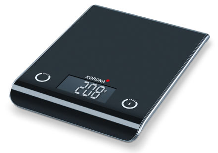 Die Korona Katja Küchenwaage ist 15 x 20 x 2,4 cm und wirkt formschön mit ihrer schwarzen bzw. auch in Weiß erhältlichen Wiegefläche, die mit silberfarbenen Metallelementen abgesetzt ist. Sie ist bis zu 3 kg belastbar und zeigt jedes Gramm an. Über die Sensortasten kann zum Beispiel die praktische Tara-Zuwiegefunktion zugeschaltet werden. Korona gewährt auf diese Waage 5 Jahre Garantie.