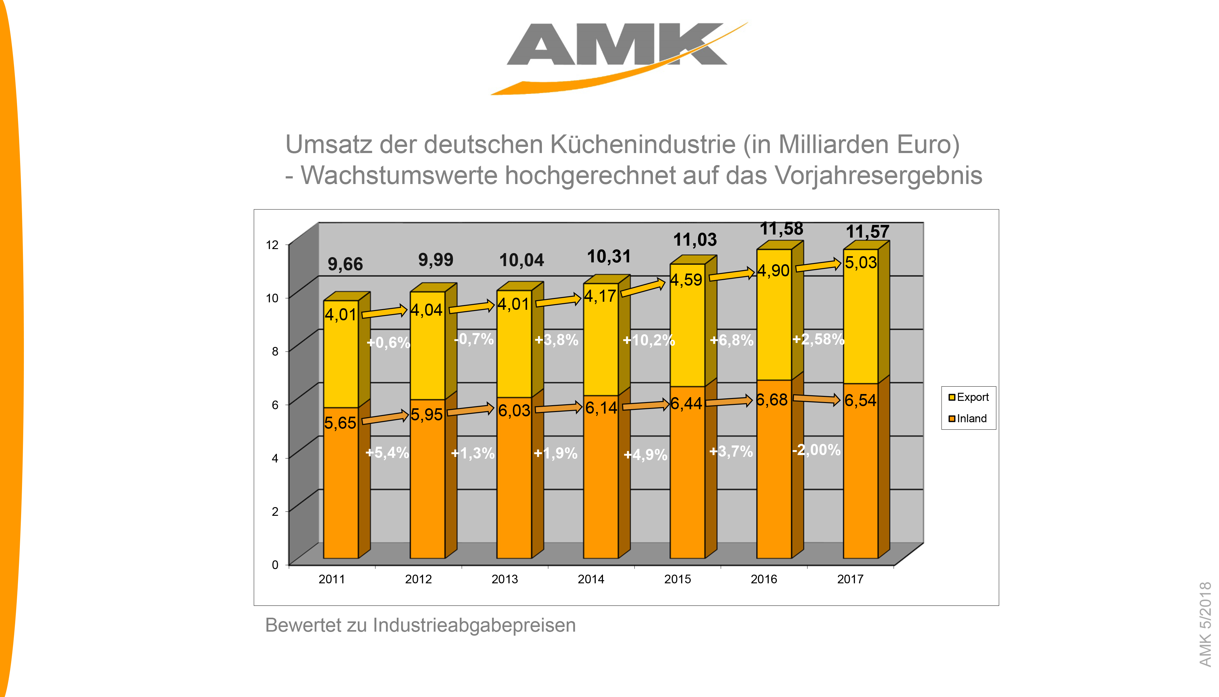 Hochgerechnet auf den Gesamtumsatz hat die deutsche Küchenindustrie im Jahr 2017 einen Gesamtumsatz in Höhe von 11,57 Mrd. Euro (Vorjahr: 11,58 Mrd. Euro) erzielt. Im Vergleich zum Allzeit-Rekord 2016 ergibt sich damit ein minimaler Rückgang um 0,1 %. Zwar konnte keine weitere Umsatzsteigerung erzielt werden, dennoch handelt es sich um das zweiterfolgreichste Jahr der Geschichte. Der Gesamtumsatz der Hersteller von Küchenmöbeln, Elektro-/ Einbaugeräten, Spülen und Zubehör hat sich damit in einem Rekordniveau stabilisiert.