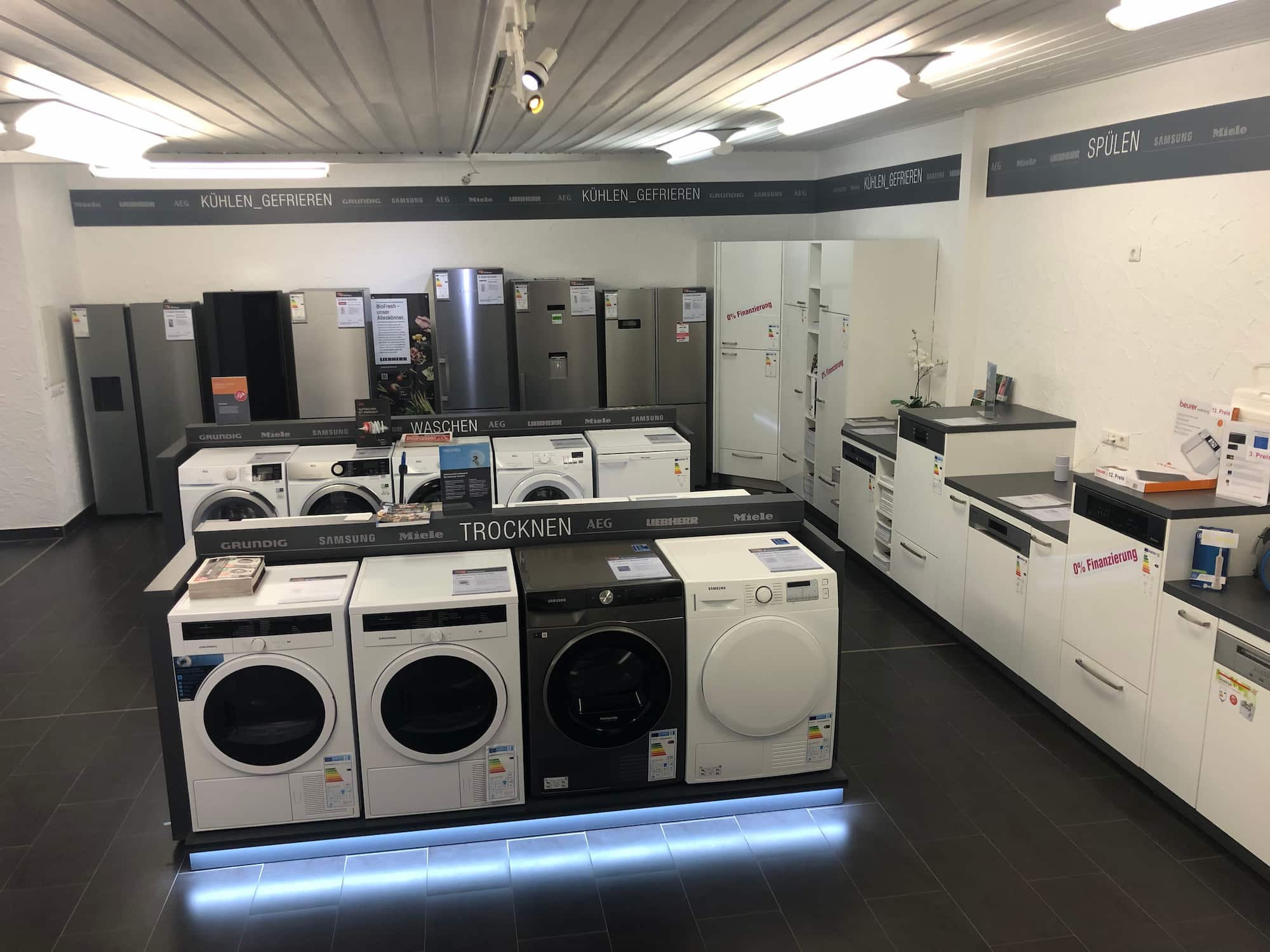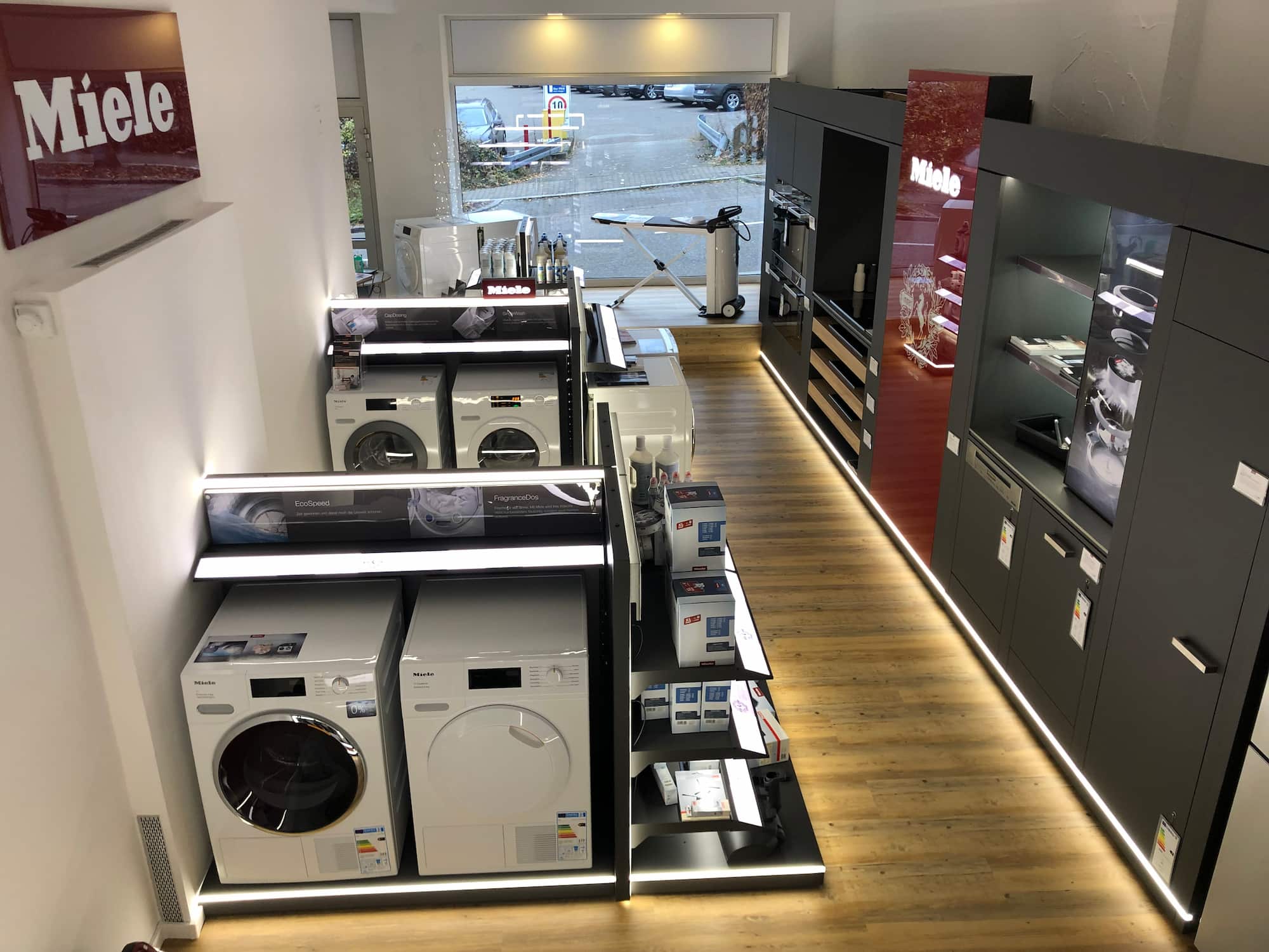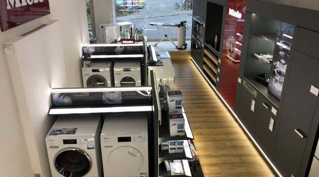 Die neuen Ladenbau-Elemente leiten die Kunden durch das Geschäft und sorgen für klare Orientierung. So sind die Großgeräte nach den Themen Spülen, Backen & Kochen sowie Waschen & Trocken gegliedert. Produktinformationen beschreiben den Mehrwert der Artikel und stellen das Plus an Lebensqualität in den Mittelpunkt. Auf rund 350 Quadratmetern stehen gut platziert hochwertige Markengeräte von AEG, Liebherr, Jura, Samsung oder Grundig, der neue Miele-Shop trägt die Kompetenz im Premium-Sortiment nach außen.