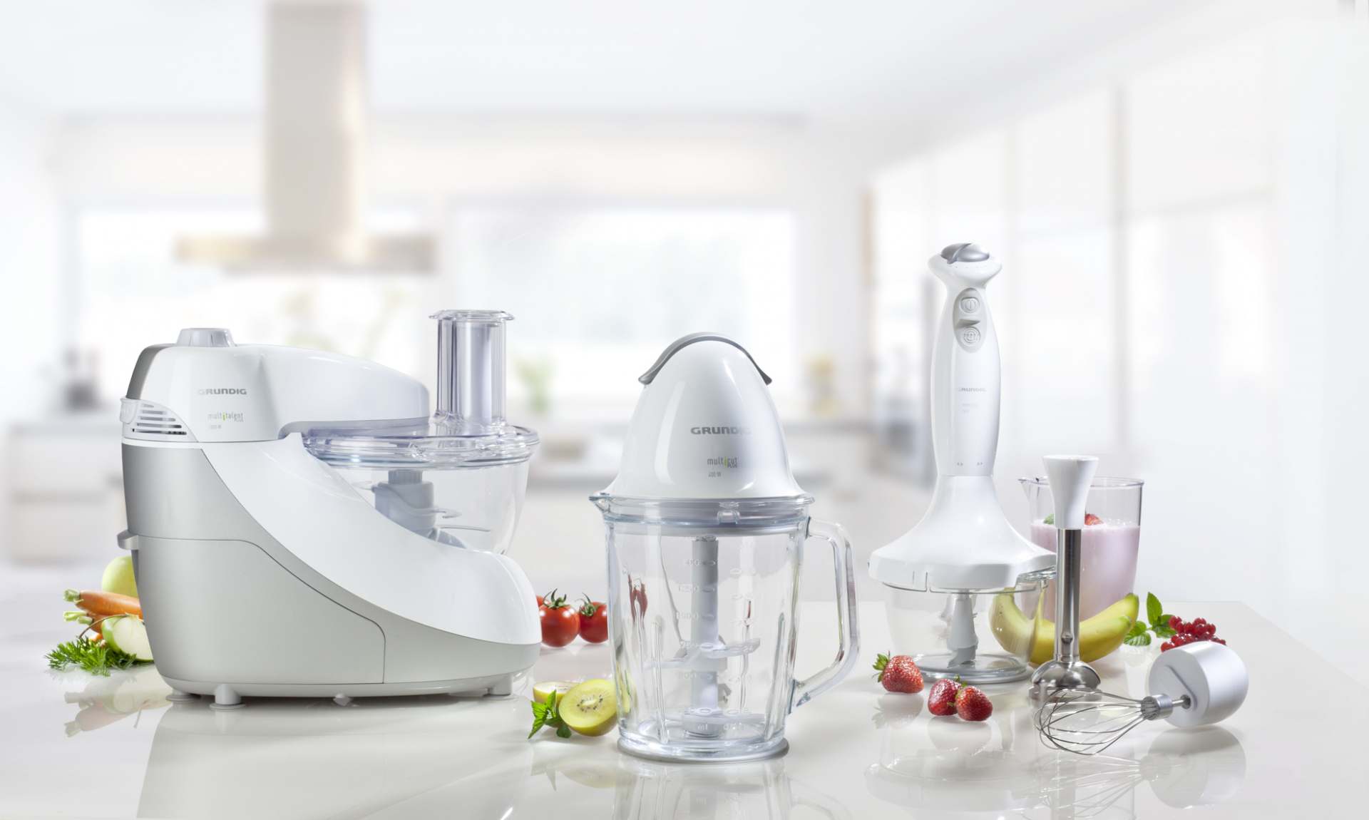 Unter dem klangvollen und Lust auf leckere Speisenzubereitung machenden Namen Cuisinery bringt Grundig eine ganze Reihe hochwertiger Küchen-Multitalente auf den Markt, die sich durch professionelle Vor- und Zubereitung verschiedenster Speisen auszeichnet – nur Kochen muss man noch selbst. Die neuen Küchenprofis von Grundig präsentieren sich in modernem und kompaktem Design in Weiss/Procon Silber. Ob Küchenmaschine, Stabmixer oder Multizerkleinerer – Grundig hat für alle anfallenden Aufgaben den richtigen Küchenhelfer parat.