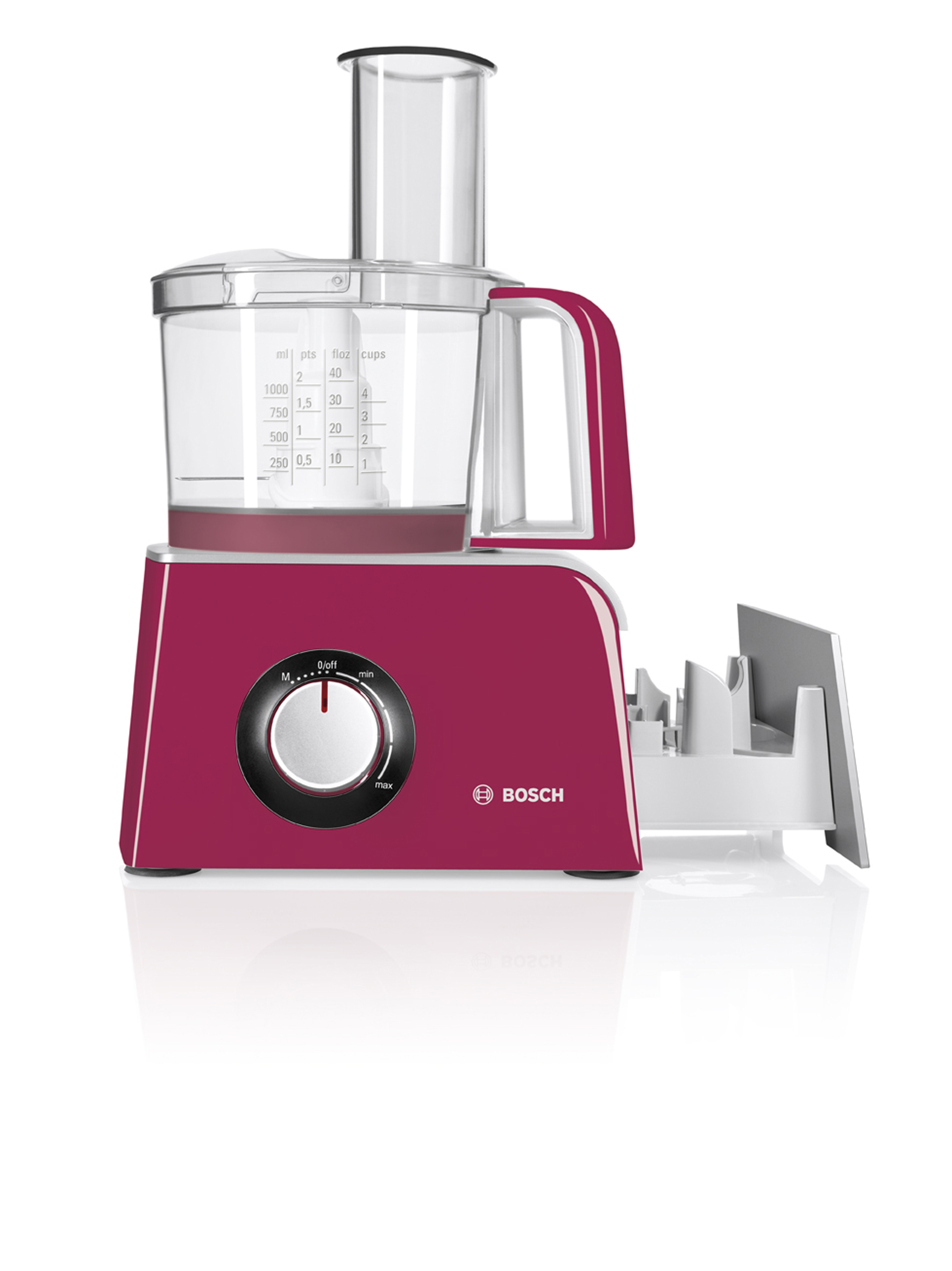 Die Küchenmaschine Bosch MCM 42024 aus der Serie Red Diamond schneidet, raspelt, zerkleinert oder knetet mit verschiedenen Scheid- und Raspel-Einsätzen.