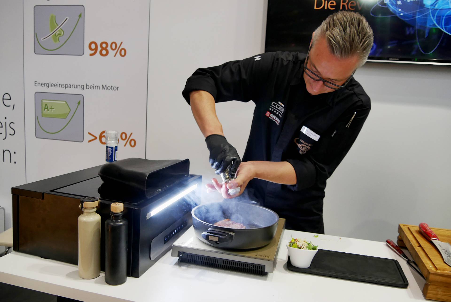 Für noch mehr Aufsehen sorgte der Auftritt von Inovvida mit seinem Geschäftsführenden Gesellschafter Udo Berling. Berling? Genau, vor 16 Jahren gründete er das Unternehmen Berbel, das seither im Markt für Dunstabzugshauben für Furore sorgt. Der Messe-Fokus von Inovvida lag beim Trendthema Tischabsaugung. Und wieder sorgt Berling für eine kleine Sensation mit der er deutlich über 95% Öl- und Fettabscheidung bei 100% gleichbleibender Saugkraft verspricht. Gearbeitet wird hier nach dem Prinzip einer Jet-Düse: die angesaugte Luft wird stark verdichtet, die Öl- und Fettpartikel in die dafür vorgesehenen Zonen zur Reinigung abgeleitet und gesammelt. Wenn man so will der Dyson unter den Dunstabzugshauben!