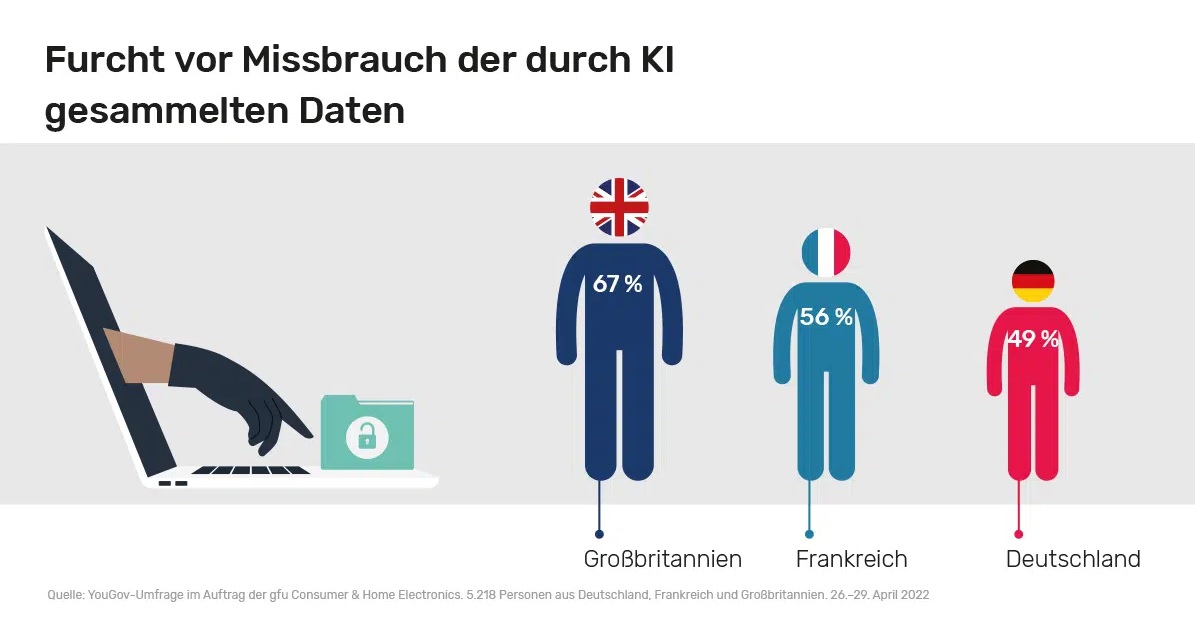 Die Zurückhaltung gegenüber der KI wird damit begründet, dass es Befürchtungen gibt, die Technologie würde zukünftig zu stark über Vorgänge im eigenen Leben bestimmen und die persönlichen Entscheidungsmöglichkeiten dadurch beschnitten. 48% der in Großbritannien befragten Studienteilnehmer sehen das so, 46% der in Frankreich befragten Personen und auch noch 39% der Befragten aus Deutschland – was dann einen Schnitt von 44% für die drei wirtschaftlich stärksten europäischen Märkte ergibt.