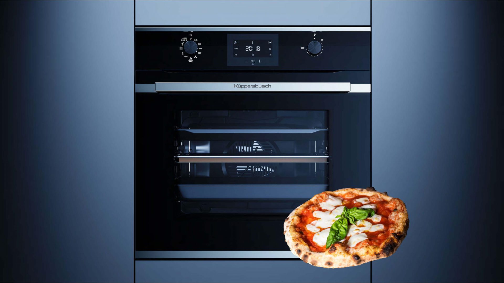 Neben der Pizzafunktion verfügt der Backofen über acht weitere Backofenfunktionen und den Küppersbusch ökotherm-Backofen-Katalysator. Dieser wandelt fettige Bratenluft in saubere Luft um. Die von Fett-, Geruchs- und Schwebstoffen belastete Luft wird von dem Lüfterrad angesaugt und durch den Katalysator gedrückt. Dabei werden alle unerwünschten Stoffe ohne Rückstände in Wasser und Kohlendioxid umgewandelt. So bleibt der Backofen wesentlich sauberer.