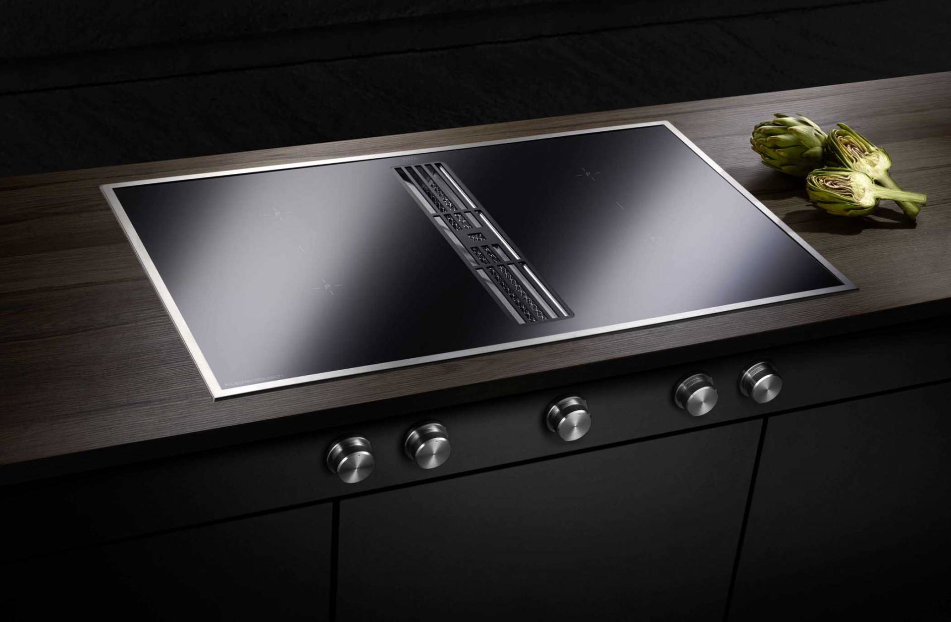 Das Küppersbusch Induktionskochfeld KMI 9850.0 hat eine integrierte Muldenlüftung und eine besonders robuste SchottCeran Miradur Beschichtung. Es wird über hochwertige Edelstahl-Knebel bedient.
