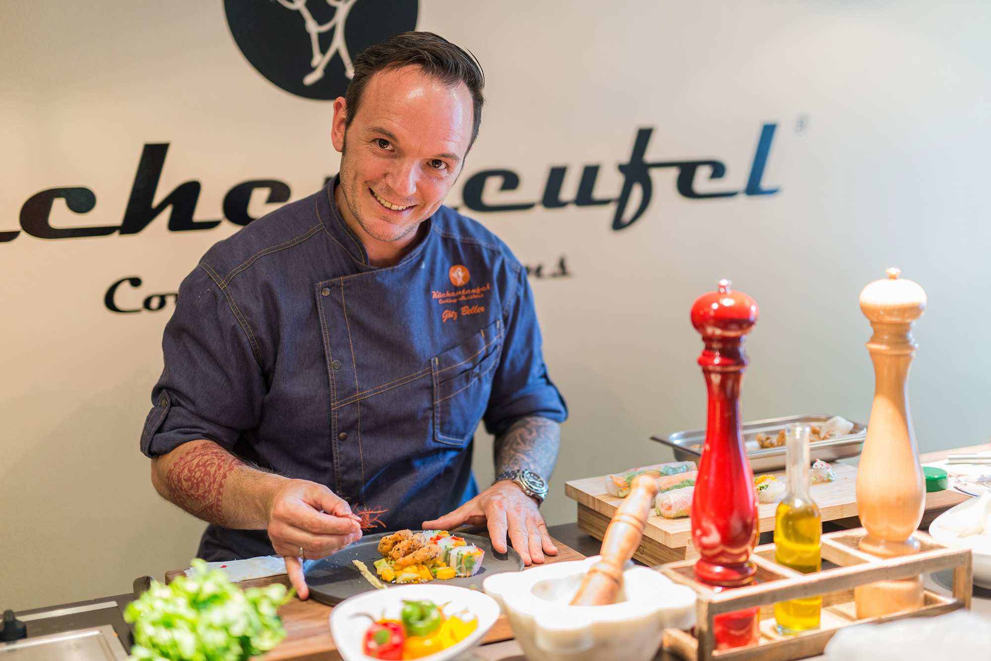 Küchenteufel Götz Beller betreibt seit sechs Jahren seine Kochschule am Münchener Viktualienmarkt.