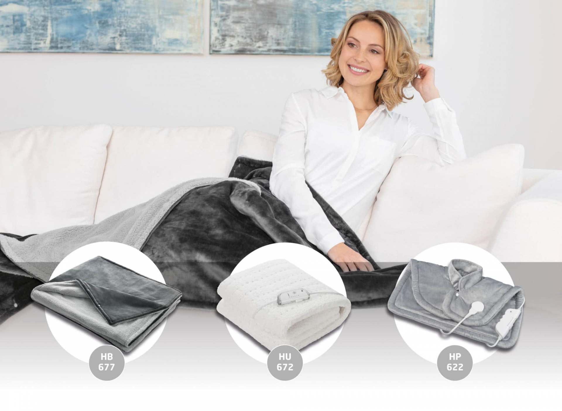 Das Schulter- und Nacken-Heizkissen HP 622 garantiert dank seiner ergonomischen Form angenehme Wärme an Schultern und Nacken, während die Wärmedecke 3in1 HB 677 wahlweise als Poncho, als Überwurf oder ganz klassisch als Wärmedecke verwendet werden kann.