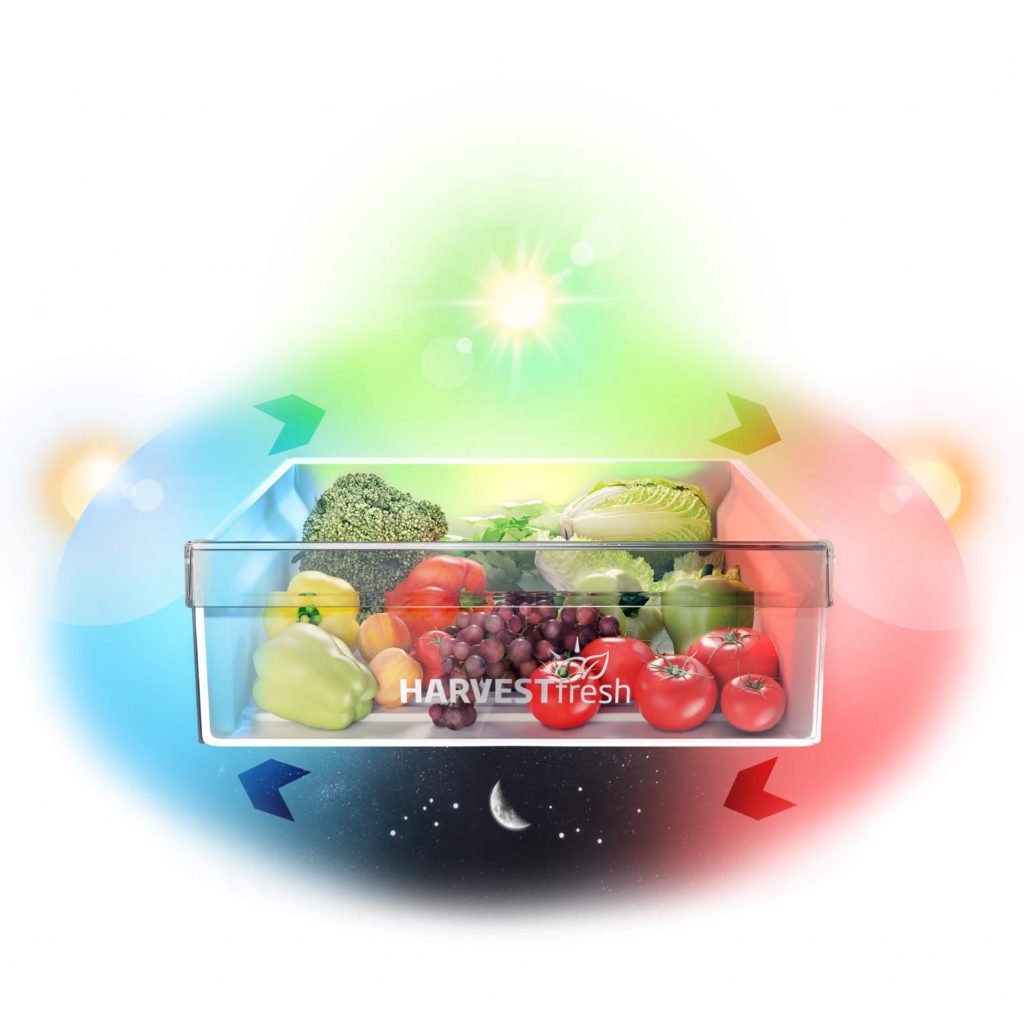 Mit der HarvestFresh-Technologie bringt Beko eine Lichtlösung in den Kühlschrank, die den natürlichen Sonnenzyklus simuliert. Durch den Wechsel von blauem, grünem und rotem Licht werden Obst und Gemüse in der speziellen Gemüseschublade länger vitaminreich gehalten. Grundlage dieser Entwicklung sind Erkenntnisse zu lichtempfindlichen Vitaminen, deren Erhalt durch gezielte Lichteinwirkung verbessert werden kann.
