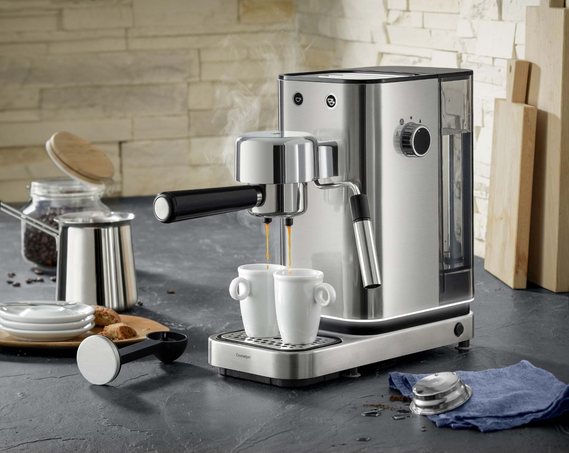 Kaffee-Kompetenz und WMF gehören einfach zusammen. Die Lumero Espressomaschine soll „Do-it-yourself Barista-Erlebnisse“ dank umfangreicher Ausstattung zu jedem nach Hause bringen. Als Pumpen-Espressomaschine konzipiert, verfügt sie über einen Druck von 15 Bar, ein integriertes, manuelles Dampfsystem für cremigen Milchschaum, heiße Milch oder heißes Wasser sowie ein Thermoblock-Wärmesystem für die optimale Zubereitungs-Temperatur. Ebenso hochwertig wie die Ausstattung ist das Design: WMF-typisches Cromargan matt und eine edle LED-Beleuchtung versprechen morgens, mittags oder abends die pure Eleganz.