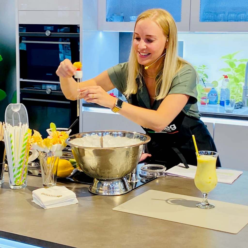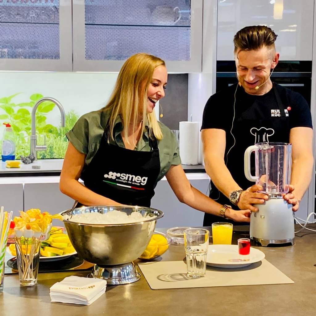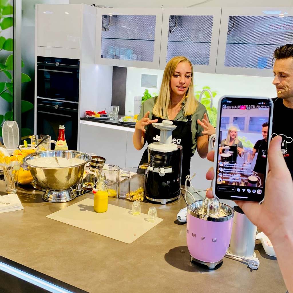 Begeisterte mit Charme, Schlagfertigkeit und Wissen: Smeg Produkttrainerin Lisa Maehl. Foto: EK/servicegroup Chapeau! Über 3.000 Menschen folgten dem Workshop in den sozialen Medien. Foto: EK/servicegroup Mit am Start: die stylischen Küchenhelfer von Smeg. Foto: EK/servicegroup Per Livestream via Facebook und Instagram werden die Genuss-Events von Küchen Ruder ausgestrahlt. Foto: EK/servicegroup Schritt für Schritt wurden in der Showküche von electroplus küchenplus Ruder köstliche Cocktails zubereitet. Foto: EK/servicegroup Das erfrischte: Cocktail-Workshop mit Lisa Maehl und Rainer Gehrke (Ruder Küchen). Foto: EK/servicegroup