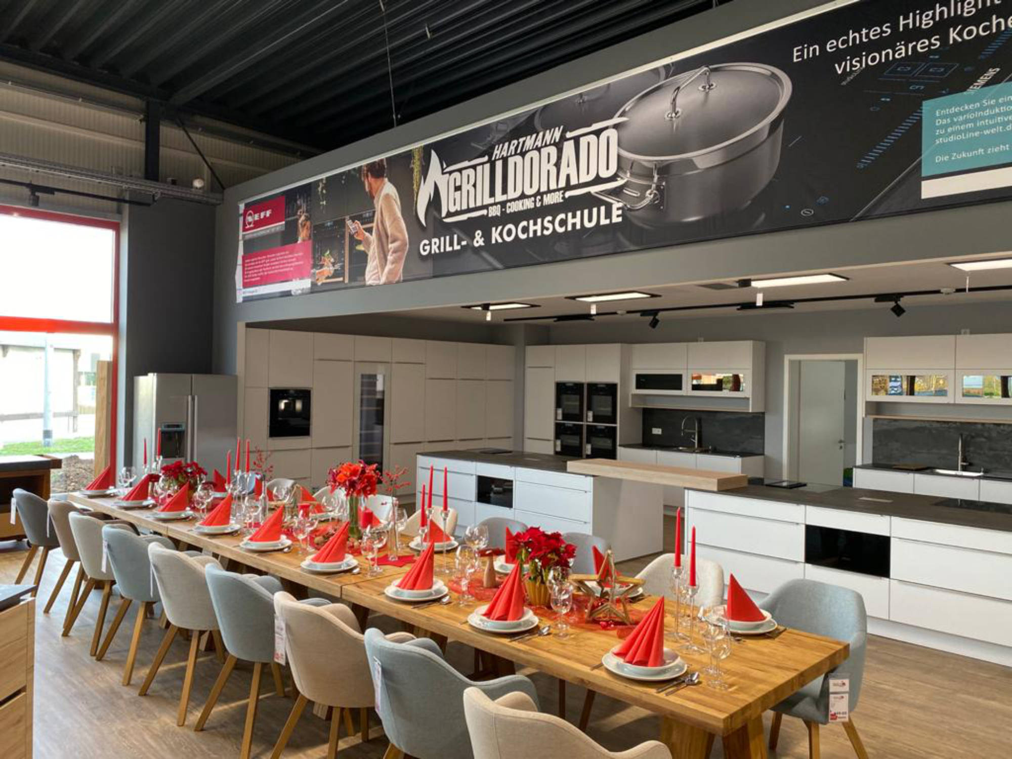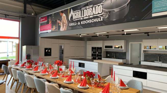Es versteht sich von selbst, dass das Grilldorado auch Grillseminare und Koch-Workshops anbietet. Dafür steht eine 200 Quadratmeter große Showküche zur Verfügung, die in einem lichtdurchfluteten Bereich des Gebäudes untergebracht ist, der sich zur Straße öffnet. Zu der Küche gehören ein Vorbereitungs- und Lagerraum, sowie die eigentliche Küche, die mit mehreren Kochfeldern, Kühlschränken – auch für Wein – Backöfen und Zubereitungsflächen ausgestattet ist. Gegessen wird an einer langen Tafel. In einem Bereich der Showküche stehen Grills für die verschiedenen Hitzequellen, sodass die Teilnehmer das Grillen auf Gas, Holzkohle oder Pellets ausprobieren können. So kann jeder selbst erfahren, was ihm liegt. Koch Mennicke erstellt die Rezepte, setzt neue Akzente zum Beispiel unter dem Motto „Franken trifft die Welt“.