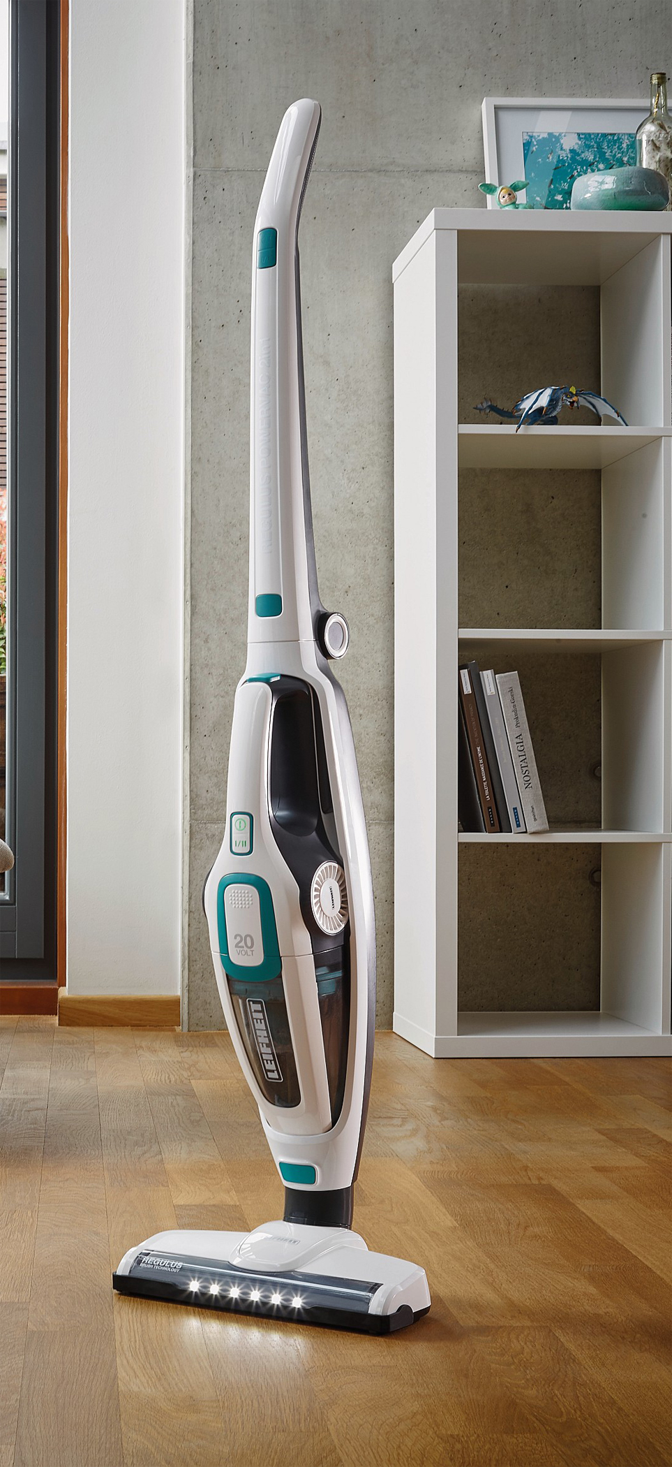 Der 20 Volt Lithium-Ionen Akku ist austauschbar. Die Betriebszeit beträgt bis zu 40 Minuten. Dies reicht auch für eine umfangreiche Hausreinigung. Zwei Leistungsstufen ermöglichen dabei eine effiziente Nutzung des Geräts: Im stromsparenden Eco-Modus können leichte Verschmutzungen entfernt werden. Starke Verschmutzungen sowie Schmutzpartikel auf Teppichen beseitigt der Turbo-Modus. Neben Fliesen und Teppichen können auch empfindliche Böden wie Parkett, Vinyl oder Laminat gereinigt werden, da er mit Softrollen und einem umlaufenden Kantenschutz am Fuß des Saugers ausgestattet ist. Eine zusätzliche LED-Frontbeleuchtung am Fuß macht zudem den Schmutz in dunklen Ecken oder unter Möbeln sichtbar.