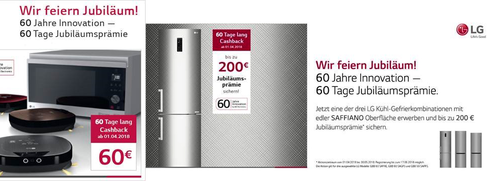 60 Jahre Innovation – das feiert LG auch mit seinen Kunden und startet mit besonderen Preisaktionen für seine Hausgeräte in den Jubiläumsfrühling. Kunden können noch bis Mai beim Kauf ausgewählter Haushaltskleingeräte 60 EUR oder bis zu 200 EUR beim Kauf von Kühl-Gefrierkombinationen in edler Saffiano Optik sparen.