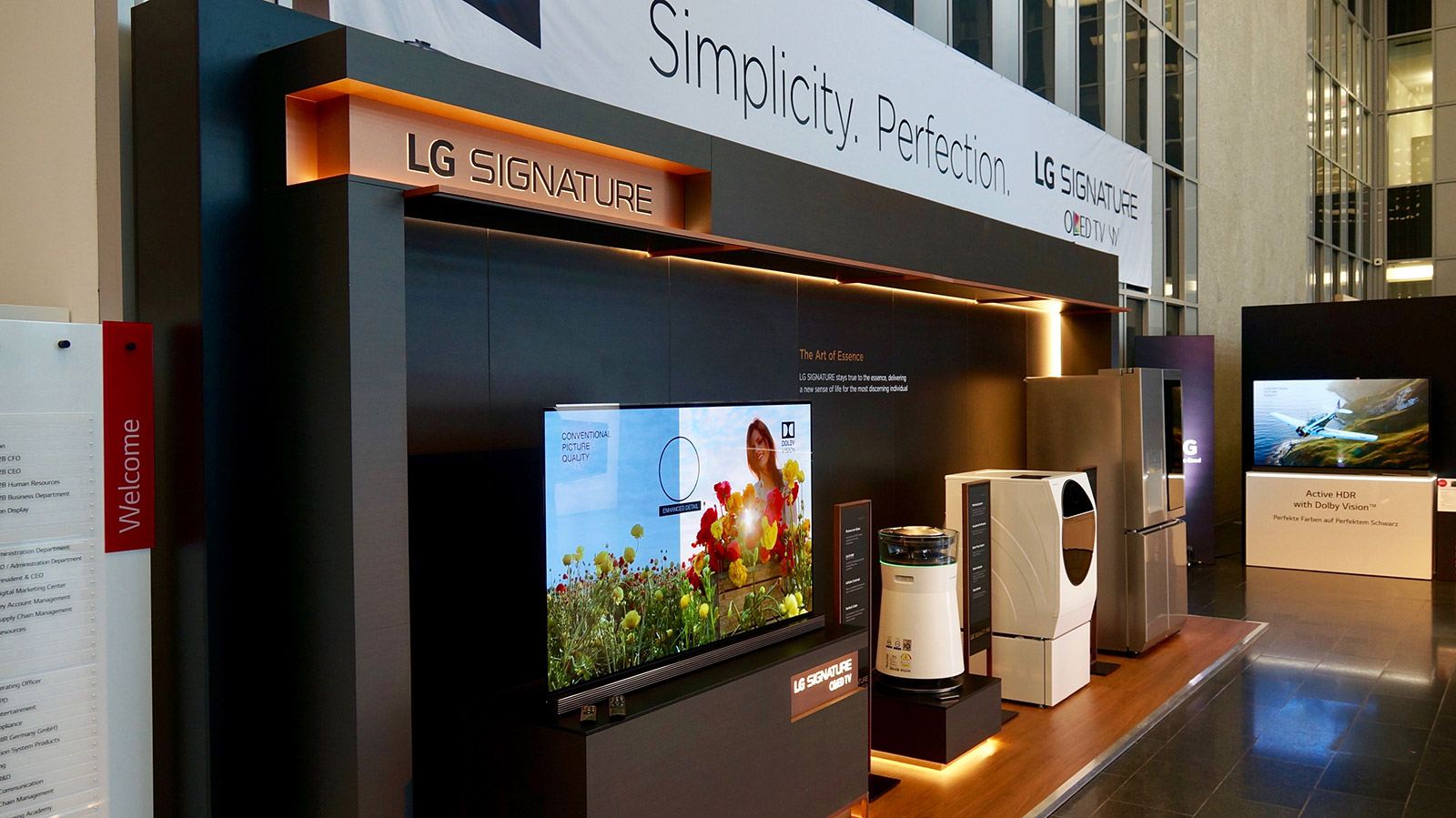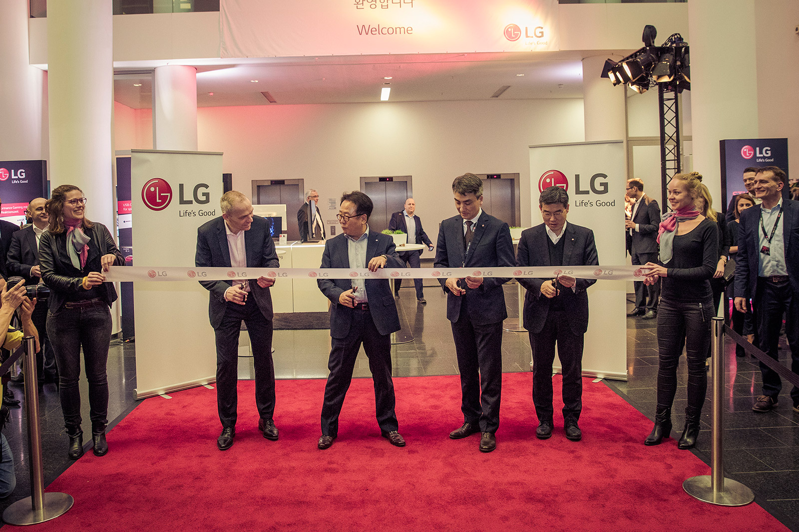 Zusammen mit der Eröffnung des neuen Standorts fiel auch der Startschuss für die LG Roadshow 2017 – schließlich bietet das Foyer der Europazentrale ausreichend Platz für eindrucksvolle Produktpräsentationen. Der Star des Abends war der LG Wallpaper OLED TV W7, ein nur 2,75 Millimeter tiefer Fernseher, der ein absolutes Novum im Home Entertainment-Bereich darstellt. Der OLED TV W7 wird mit Magneten an der Wand befestigt, unterstützt alle gängigen HDR-Formate und bringt mit Dolby Atmos Kino-Feeling in jedes Wohnzimmer – ein absolutes Highlight für Cineasten!
