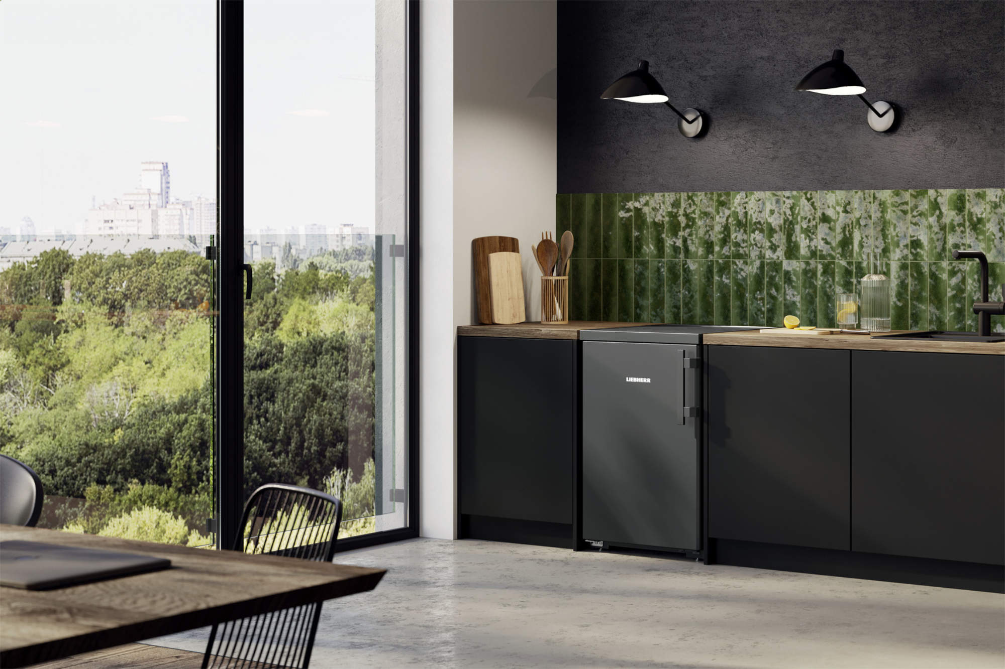 Der ebenfalls in DarkGrey erhältliche Tischkühlschrank Rdgd 1400 verfügt über eine kratzresistente Arbeitsplatte, einen Hebelgriff mit Öffnungsmechanismus sowie eine DoorStop-Funktion, die die Tür bei Nutzung offen hält – besonders geeignet für Einsatzorte wie Ferienwohnungen oder Nebenräume.