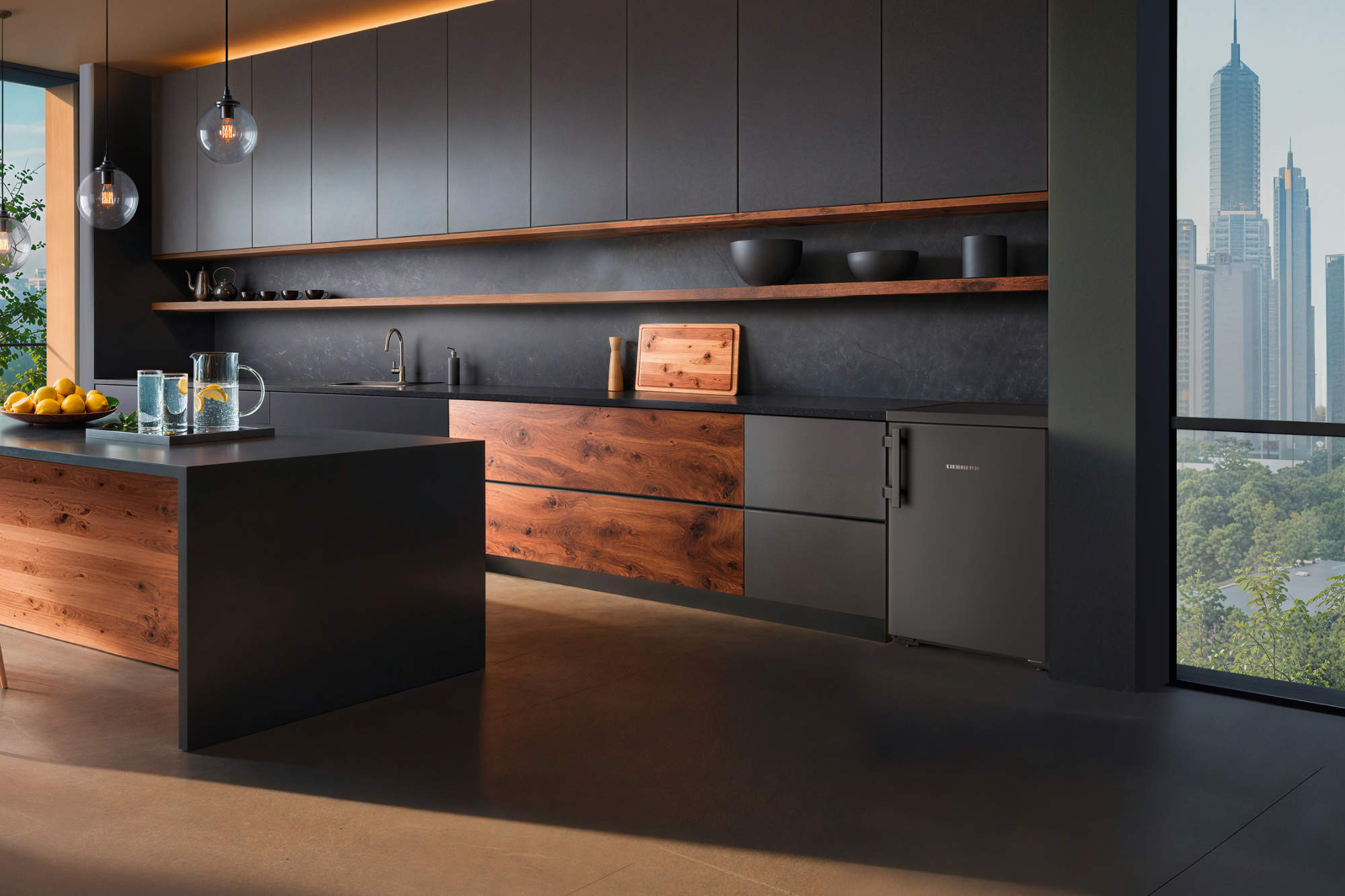 Der Farbton DarkGrey ist auf eine ruhige, warme Ästhetik ausgelegt, die sich harmonisch in verschiedene Umgebungen einfügt – sowohl in klassische Küchen als auch in offen gestaltete Wohnküchen. Besonders gut lässt sich die Oberfläche mit Materialien wie Holz, Stein oder Beton kombinieren. Damit trägt der Farbton dazu bei, die Kühlgeräte gestalterisch in das Raumkonzept zu integrieren.