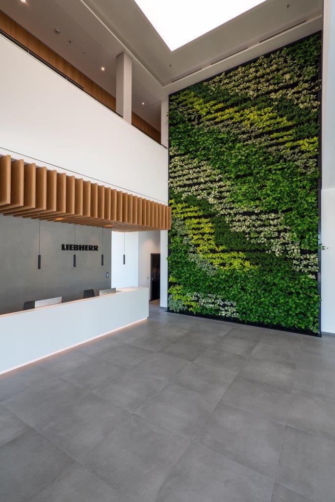 Ein Highligt des neuen Gebäudes ist die „grüne Wand“ im Foyer des Kundenzentrums. Die Pflanzen produzieren Sauerstoff und sorgen für ein gutes Raumklima, erhöhen die Luftfeuchtigkeit und kühlen im Sommer den Eingangsbereich.