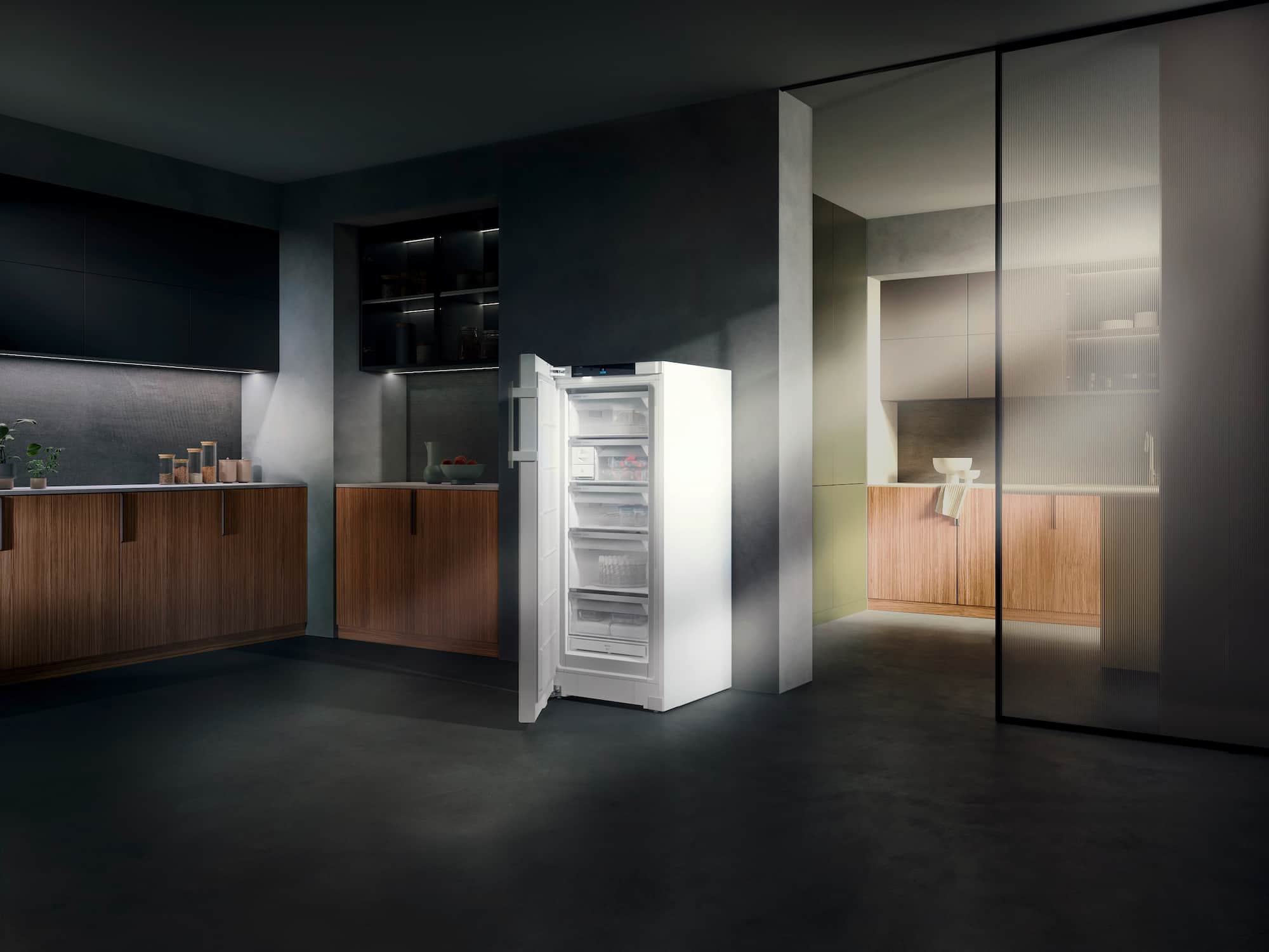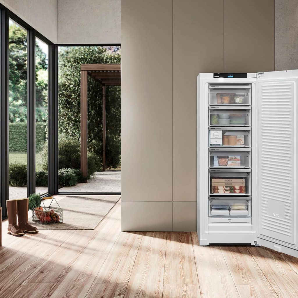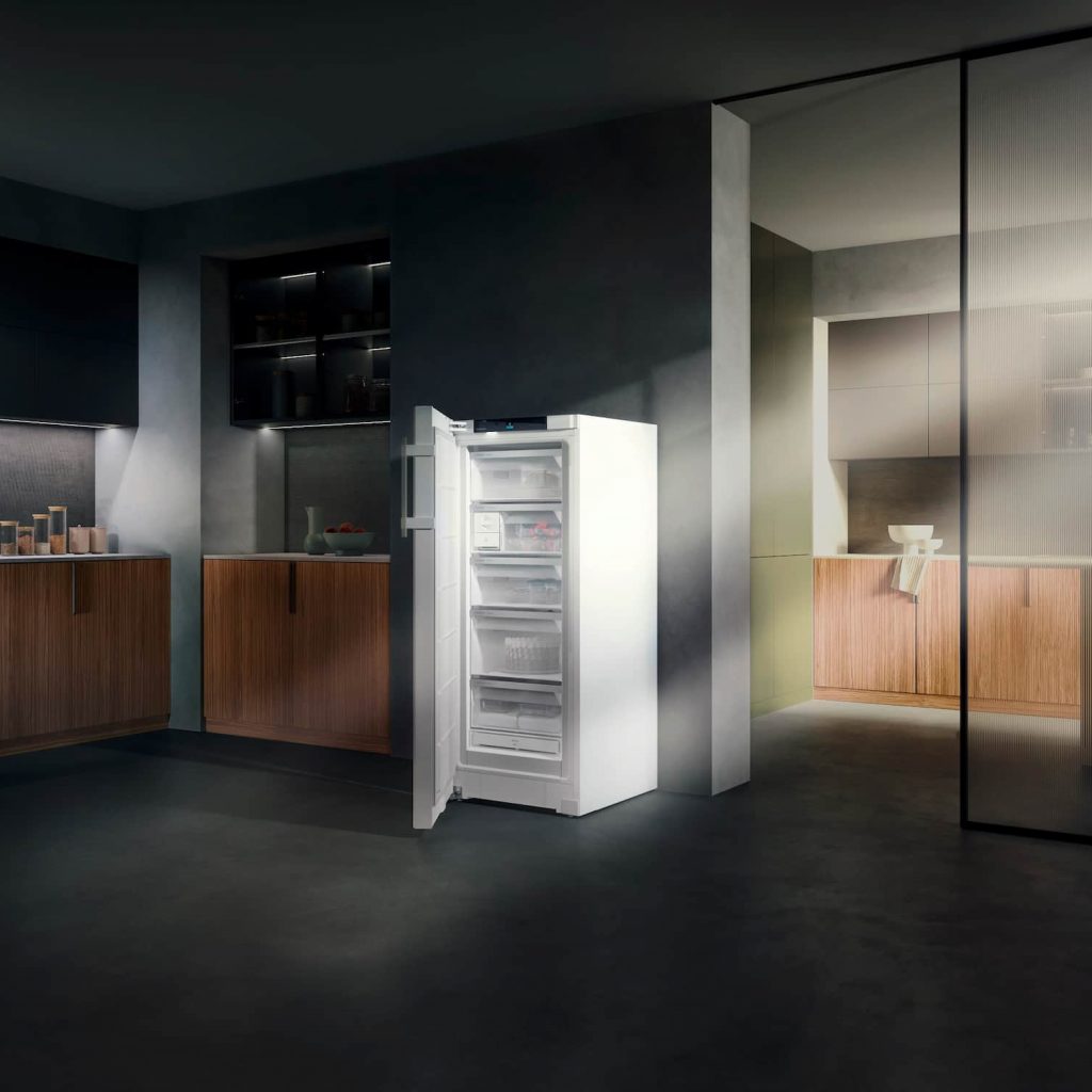 Auf dieser Basis bietet Liebherr derzeit als nach eigenen Angaben einziger Hersteller zwei Gefriergeräte in der für dieses Segment aktuell höchsten Energieeffizienzklasse B an. Neben dem FNb 5056 mit der BluRoX-Tür ist das aktuelle Highlight mit konventioneller Dämmung der FNb 4655 – und ab nächstem Jahr dessen werkseitig vernetzte Variante FNb 465i. Der 145 cm hohe Gefrierer ist ausgestattet mit NoFrost, bietet fünf Schubfächer mit integrierter Führung, EasyTwist-Ice, SpaceBox, EasyOpen, FrostProtect, LEDBeleuchtung und viele weitere Merkmalen der Prime-Ausstattung.