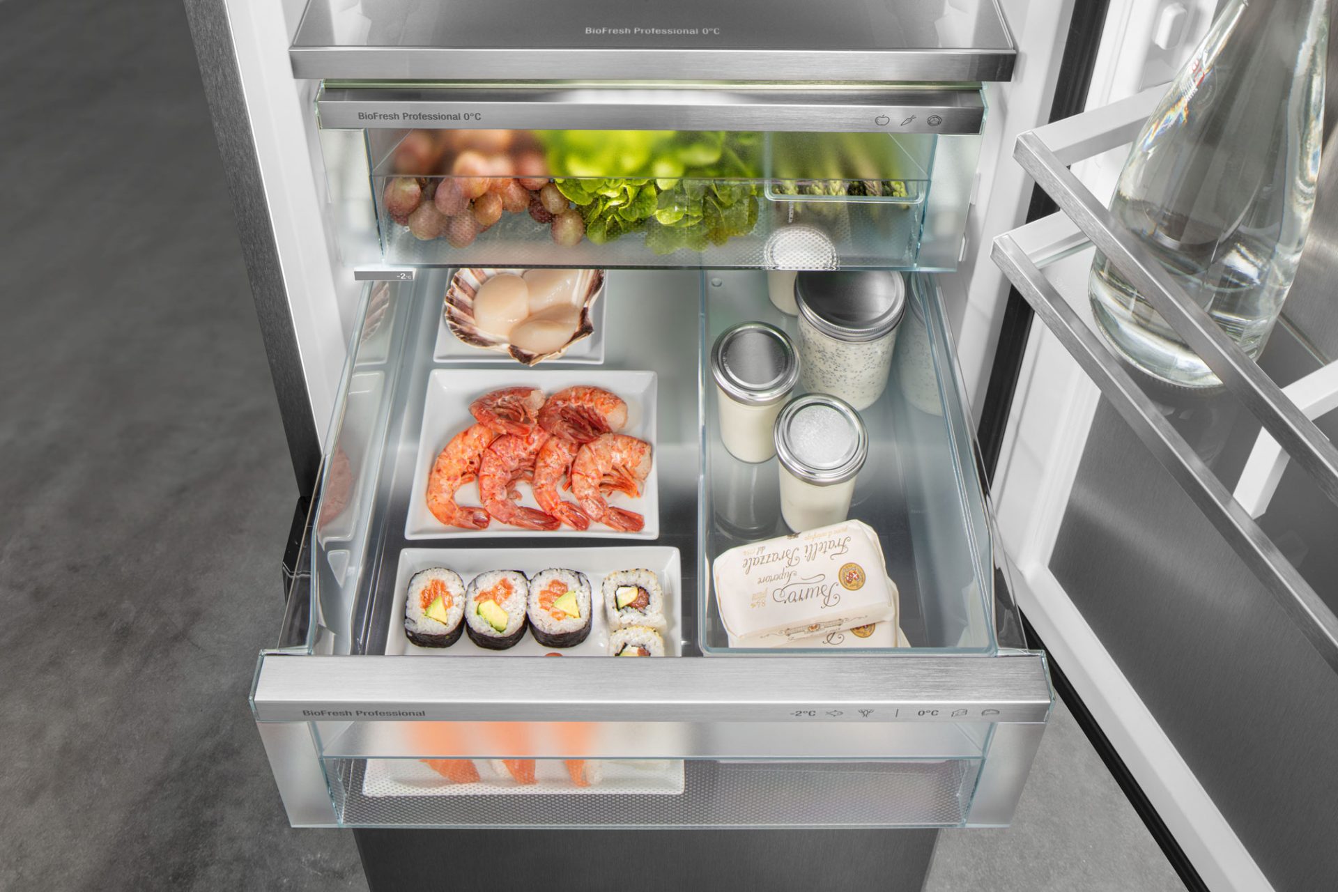 Mit dem BioFresh Professional Fish & Seafood-Safe hat Liebherr ein separates Fach entwickelt, das Fisch und Meeresfrüchte bei -2 °C optimal kühlt und individuell regulierbar ist. In Kühlgeräten der Peak-Serie legt sich für einen zusätzlichen Frische-Effekt zudem der feine Frischenebel HydroBreeze auf Obst und Gemüse. Unentwegt frisches Wasser direkt aus dem Kühlschrank liefert der integrierte Wasserspender mit Filtersystem InfinitySpring.