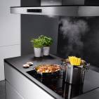 Das Schöne ist: Auch bei den Einbaugeräten wächst die Farbpalette. Neff beispielsweise bietet für die Wandessen einen kreativen Dunstabzug an, der nicht nur Farbe (schwarz, grün oder orange), sondern auch ein individualisierbares Lichtspiel in die Küche bringt. Zum einen lassen sich auf der Wandesse Kochbücher abstellen und Bilder oder Postkarten per Magnet befestigen, und die Oberfläche lässt sich sogar beschreiben. Zweitens lassen sich Dunstabzug und Kochfeld per WLAN für einen automatisch angepassten Betrieb steuern. Eine AmbientLight-Funktion ermöglicht es zudem, aus 31 unterschiedlichen Farbstufen einen passenden Farbton für jede Atmosphäre auszuwählen.
