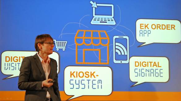 Neue Ansätze sieht die Verbundgruppe EK insbesondere durch die Möglichkeiten der digitalen Transformation. Susanne Sorg, zuständiges Vorstandsmitglied für alles Digitale, wurde dann auch sehr konkret und zeigte anhand des „Omnichannel Baukasten“ der EK auf, welches Repertoire bei der EK bereits zum digitalen Standard gehört: beispielsweise die Regalverlängerung per digitalem Kiosksystem, Digital Signage oder einfach „nur“ die Basic-Leistung einer digitalen Visitenkarte. Sorg: „Omnichannel bei der EK – das ist nicht Zukunft, das ist Gegenwart.“