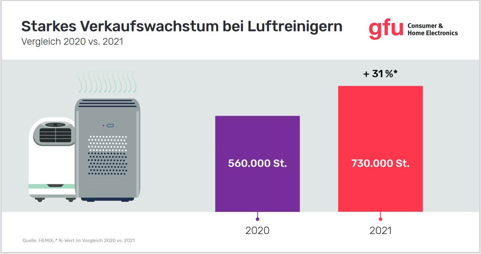 Nach rund 560.000 verkauften Luftreinigern im Jahr 2020, dem ersten Jahr in der Pandemie, wurden 2021 über 730.000 dieser Geräte in Deutschland verkauft. Das entspricht einem Plus von 31%. Damit wurde ein Umsatzvolumen von rund 181 Mio. EUR erzielt, ein Wachstum von 18%.