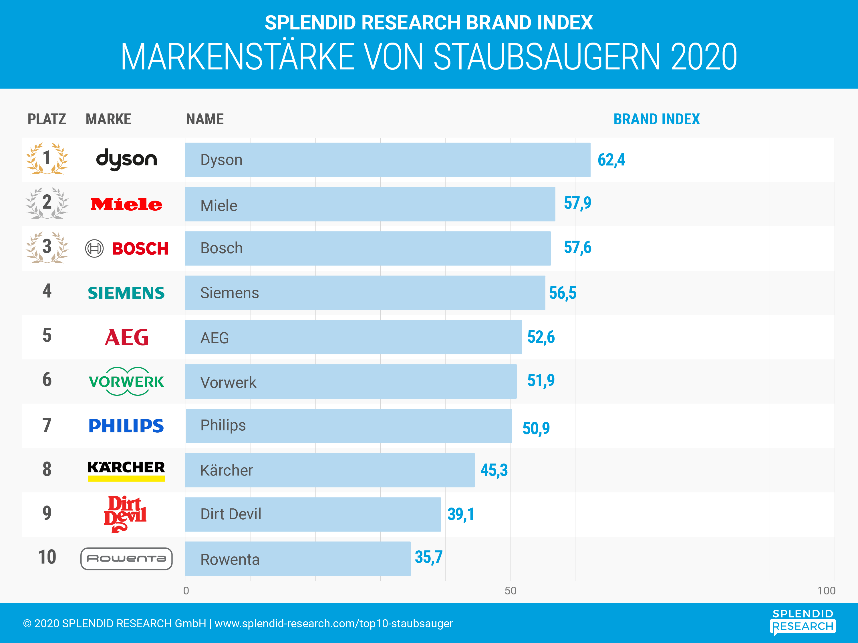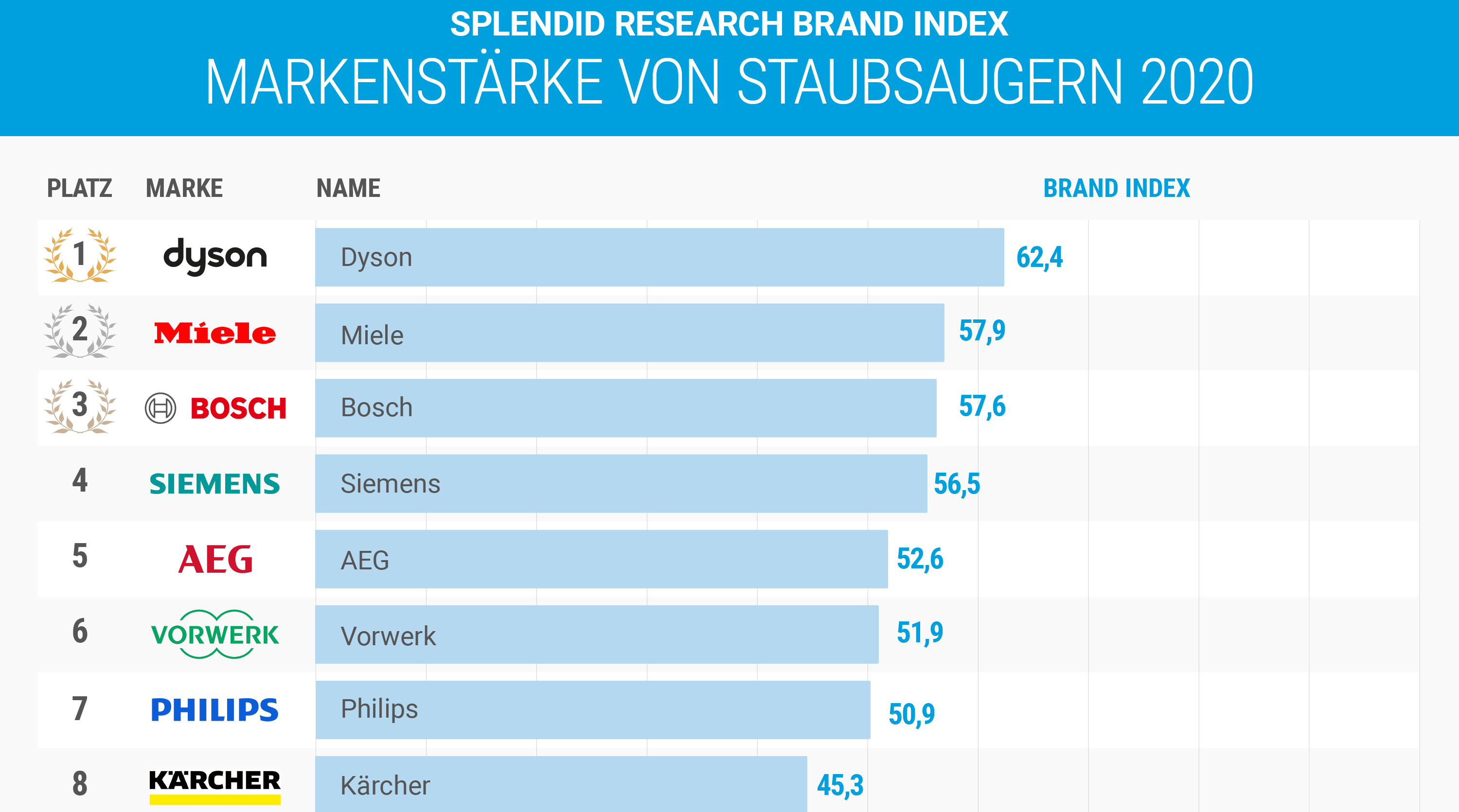Das Hamburger Marktforschungsinstitut Splendid Research hat im November 2020 im Rahmen einer repräsentativen Umfrage 1.523 Deutsche zwischen 18 und 69 Jahren online zum Thema Staubsauger befragt. Untersucht wurde, welche Marken des unverzichtbaren Haushaltshelfers am bekanntesten sind, über welches Image sie verfügen und wie hoch die Kauf- beziehungsweise die Wiederkauf-Wahrscheinlichkeit ist.
