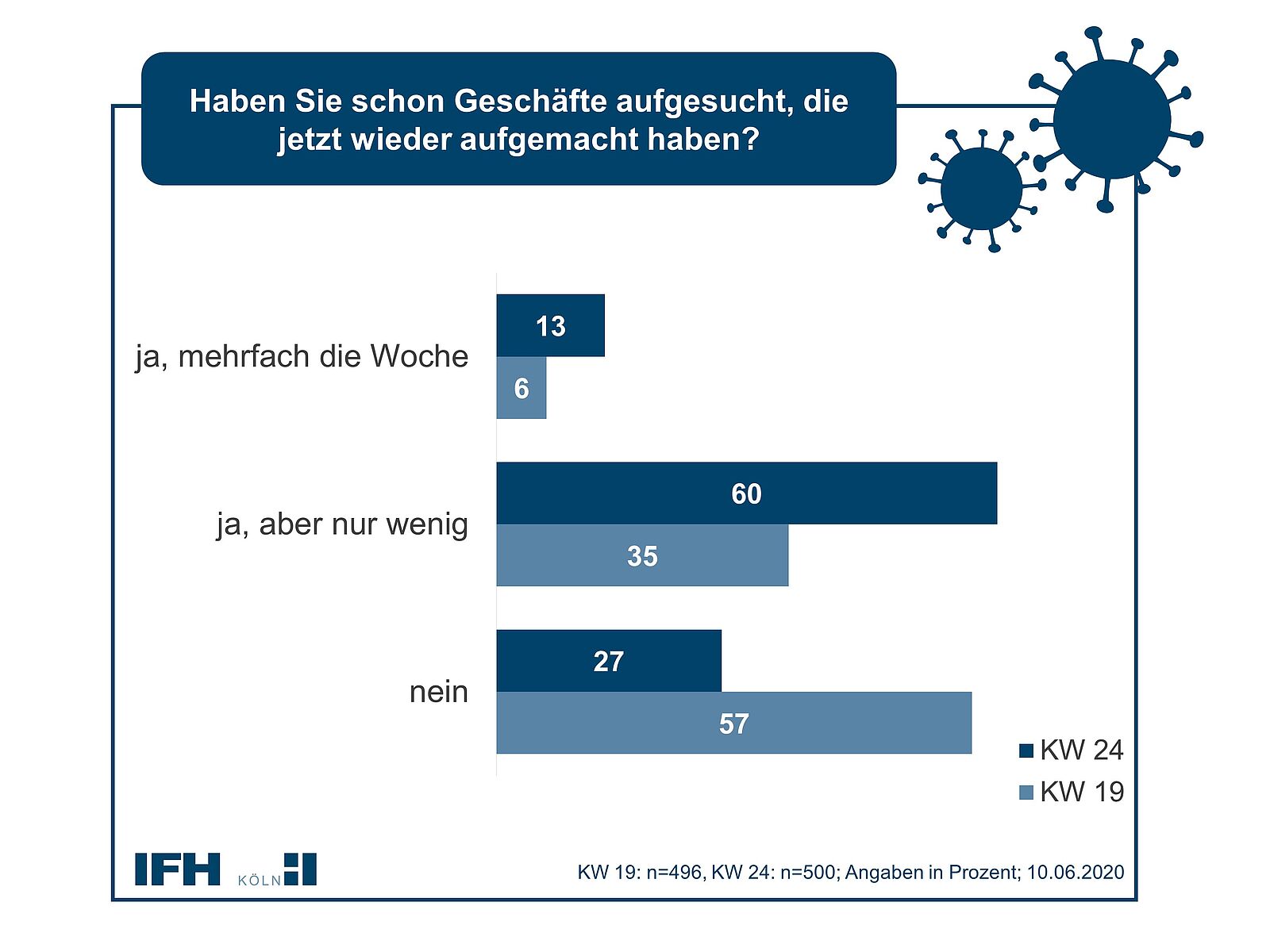 Die gute Nachricht: Die Konsumenten gehen wieder vermehrt in stationären Geschäften einkaufen. Während bei der letzten Befragung des Corona Consumer Check in KW 19 erst 35% der Befragten angaben, wieder ab und zu Geschäfte aufzusuchen, bejahen aktuell bereits 60% diese Frage. 13% geben sogar an, mehrfach wöchentlich Geschäfte zu besuchen – hier lag der Wert vor fünf Wochen noch bei 6%. Auch die strikte Ablehnung des Einkaufens vor Ort geht stark zurück: Aktuell geben 27 % an, geöffnete Geschäfte noch nicht aufgesucht zu haben. In KW 19 lag dieser Wert noch bei 57%.