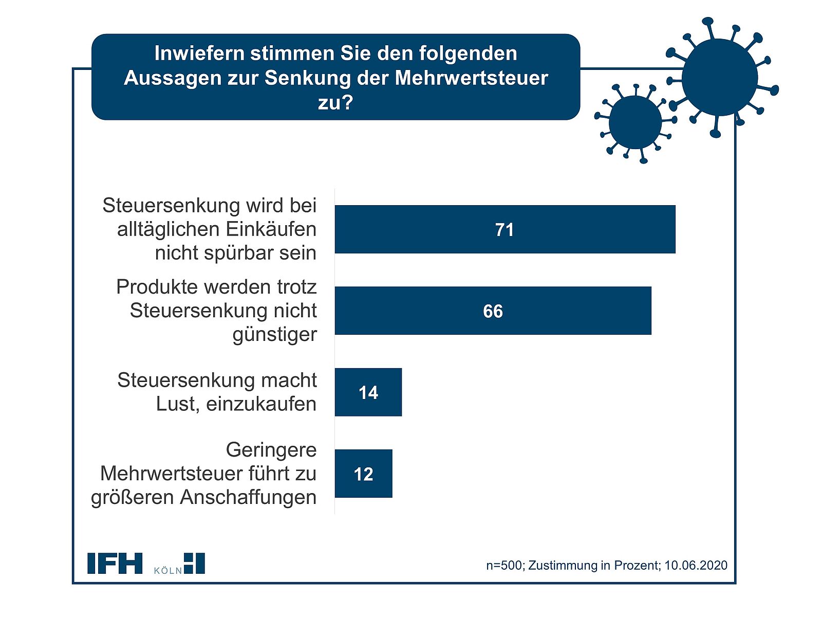 71% der Befragten sind in Punkto Mehrwertsteuersenkung skeptisch und glauben, dass sie von der ab Juli geplanten Steuersenkung beim Einkauf nichts spüren werden und dass Produkte nicht günstiger werden (66%). Entsprechend ist auch die Einkaufslust nur bei 14% der Konsumenten angereizt; lediglich 12% geben an, nun größere Anschaffungen vorzunehmen.