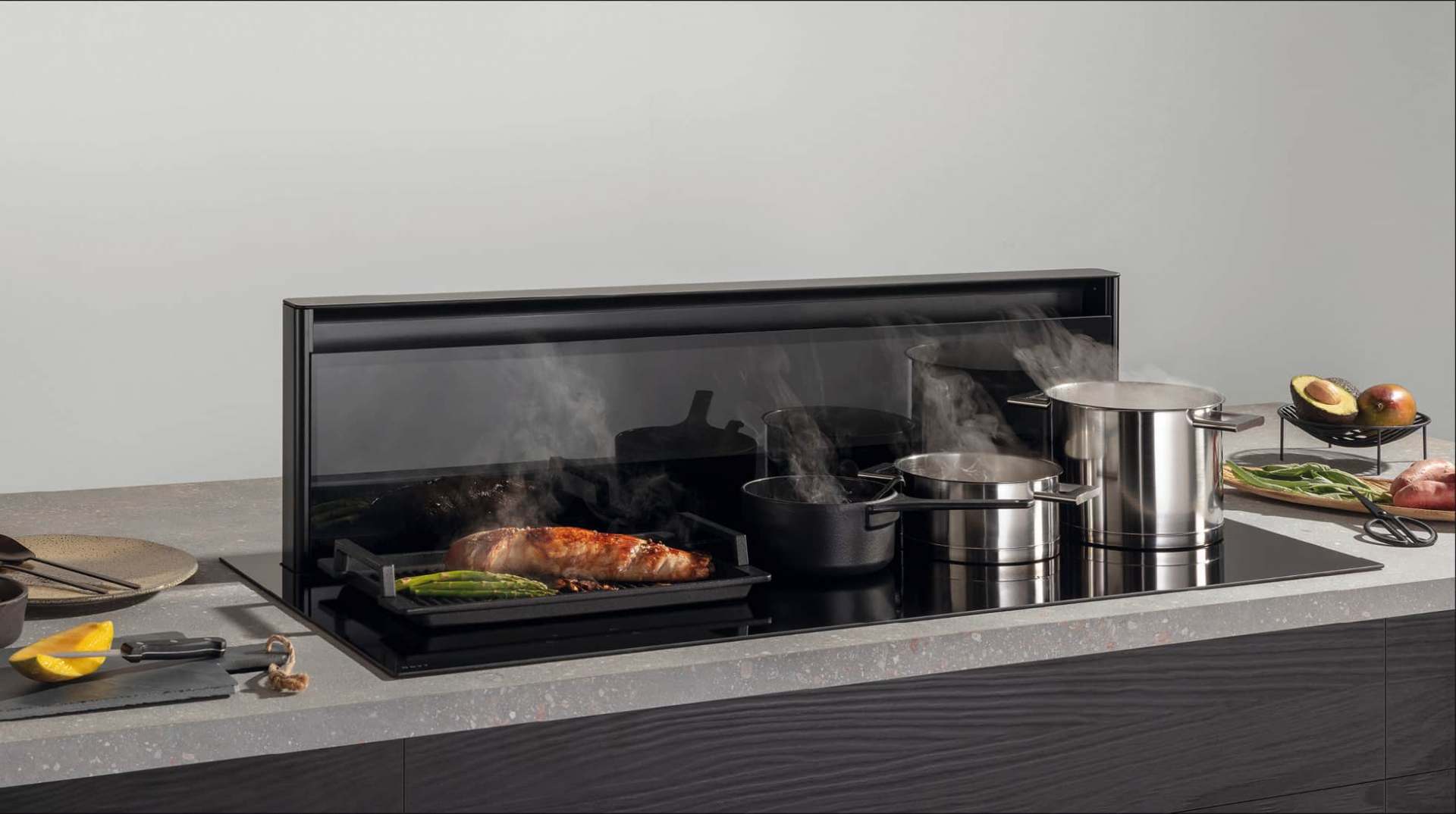 Bis zu fünf Töpfe finden auf dem Induktionskochfeld nebeneinander Platz. Dahinter fährt der Absaugschirm via Touchsteuerung langsam in die Höhe und eliminiert alle Kochgerüche – leise und hoch effizient. Das Produkt von Novy saugt die Kochdünste nicht wie andere Muldenlüfter nach unten ab, sondern fängt sie dort auf, wo sie entstehen – an der Oberkante des Kochtopfs.