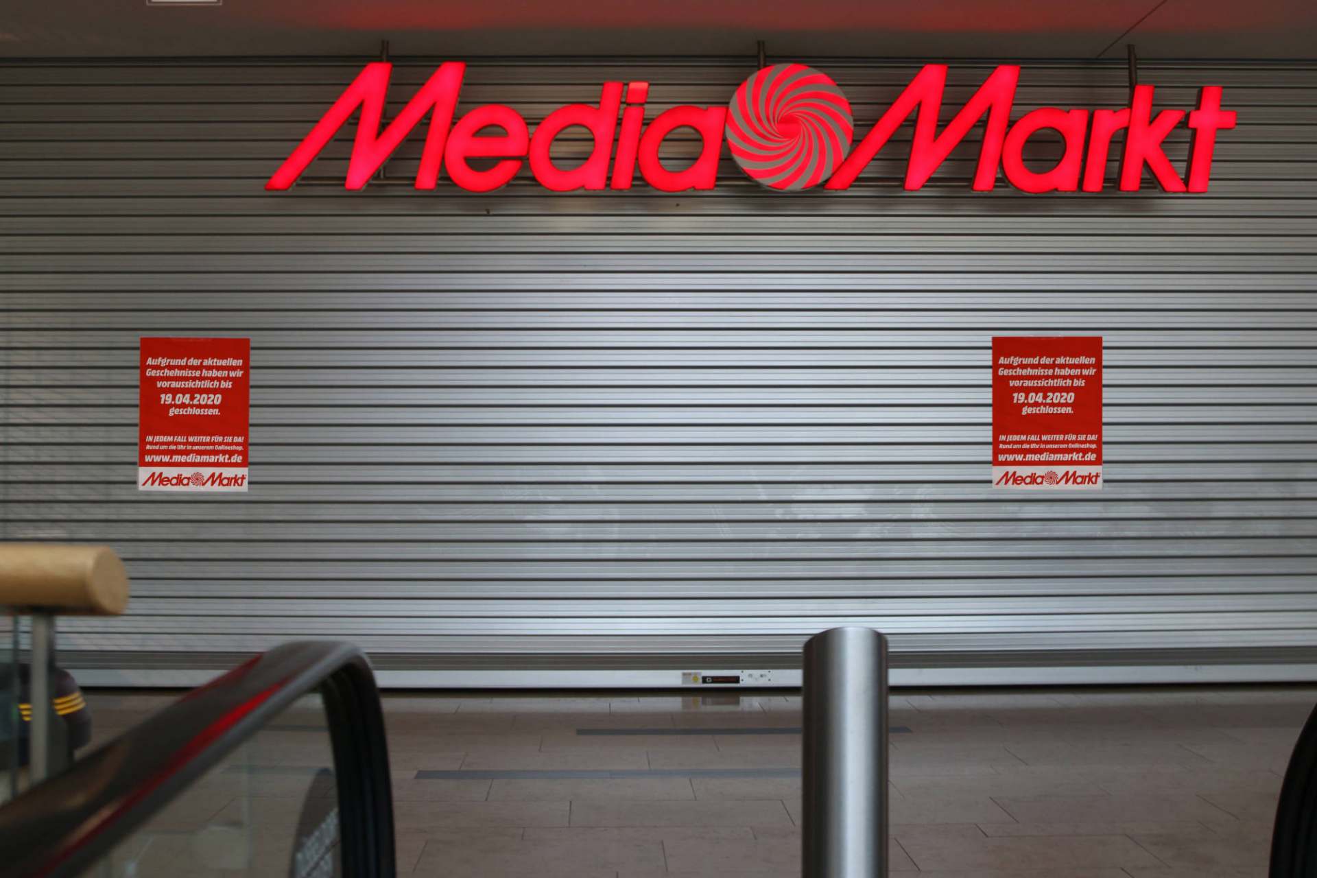 „Aufgrund der aktuellen Geschehnisse haben wir voraussichtlich bis 19.04.2020 geschlossen. In jedem Fall für Sie da! Rund um die Uhr in unserem Onlineshop. www.mediamarkt.de“, lautet der Text auf den heruntergelassenen Rolltoren über die gesamte sichtbare Breite des Marktes. Und auch das Service-Center mit seiner Reparaturannahme ist geschlossen. Nichts geht mehr!