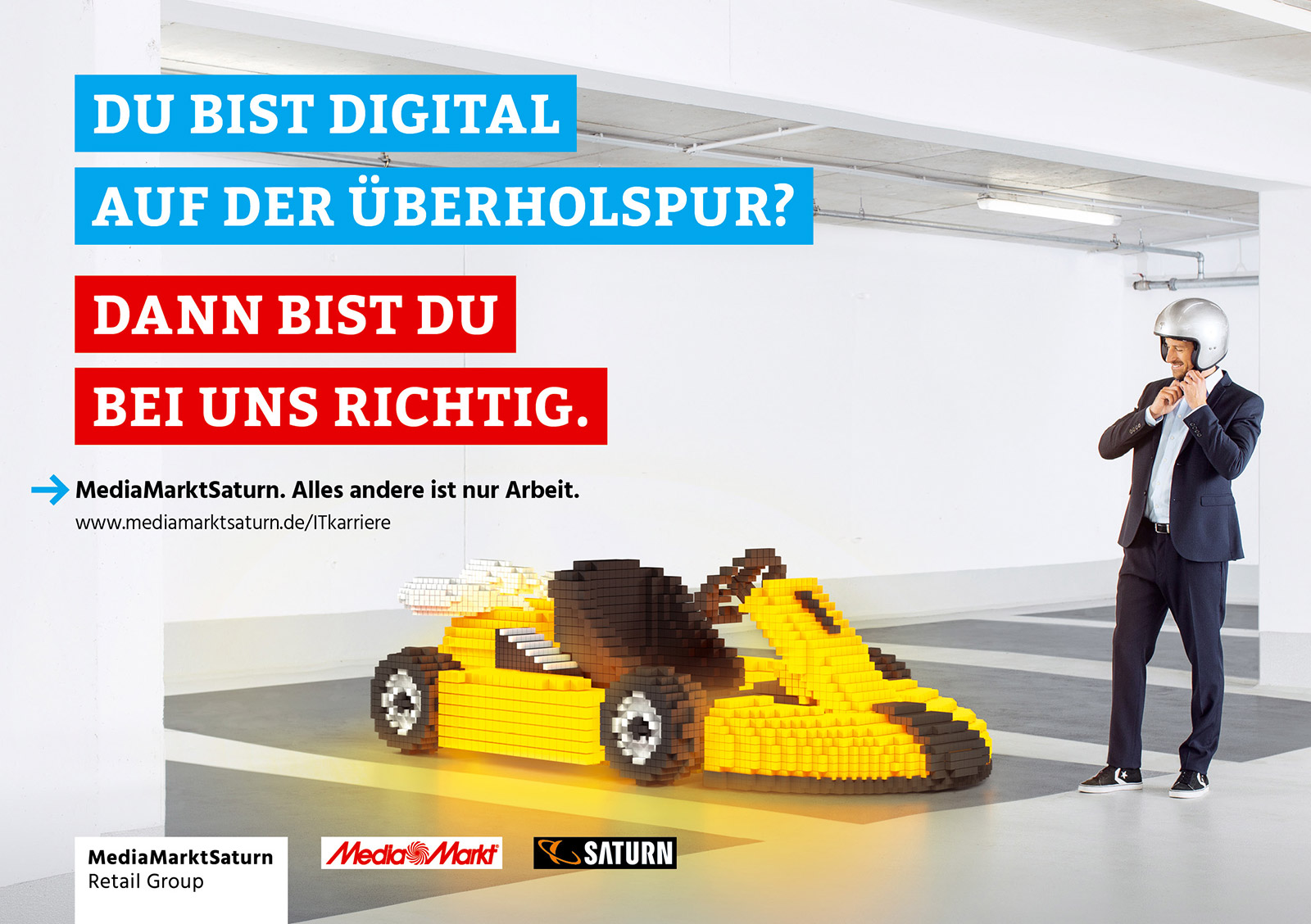 Zeitgleich mit dem neuen Markenauftritt geht MediaMarktSaturn auch mit einer Recruiting-Kampagne für IT-Fachkräfte live. Das Unternehmen stellt diejenigen in den Vordergrund, für die die IT von MediaMarktSaturn der ideale Arbeitsplatz ist, und spricht sie direkt an. In den Kampagnenmotiven werden Fragen wie „Du zeigst Haltung?“ „Du lebst digital auf der Überholspur?“ „Du begegnest Routine mit Fantasie?“ beantwortet mit „Dann bist Du bei uns richtig“. Der Kampagnenclaim lautet „MediaMarktSaturn. Alles andere ist nur Arbeit.“