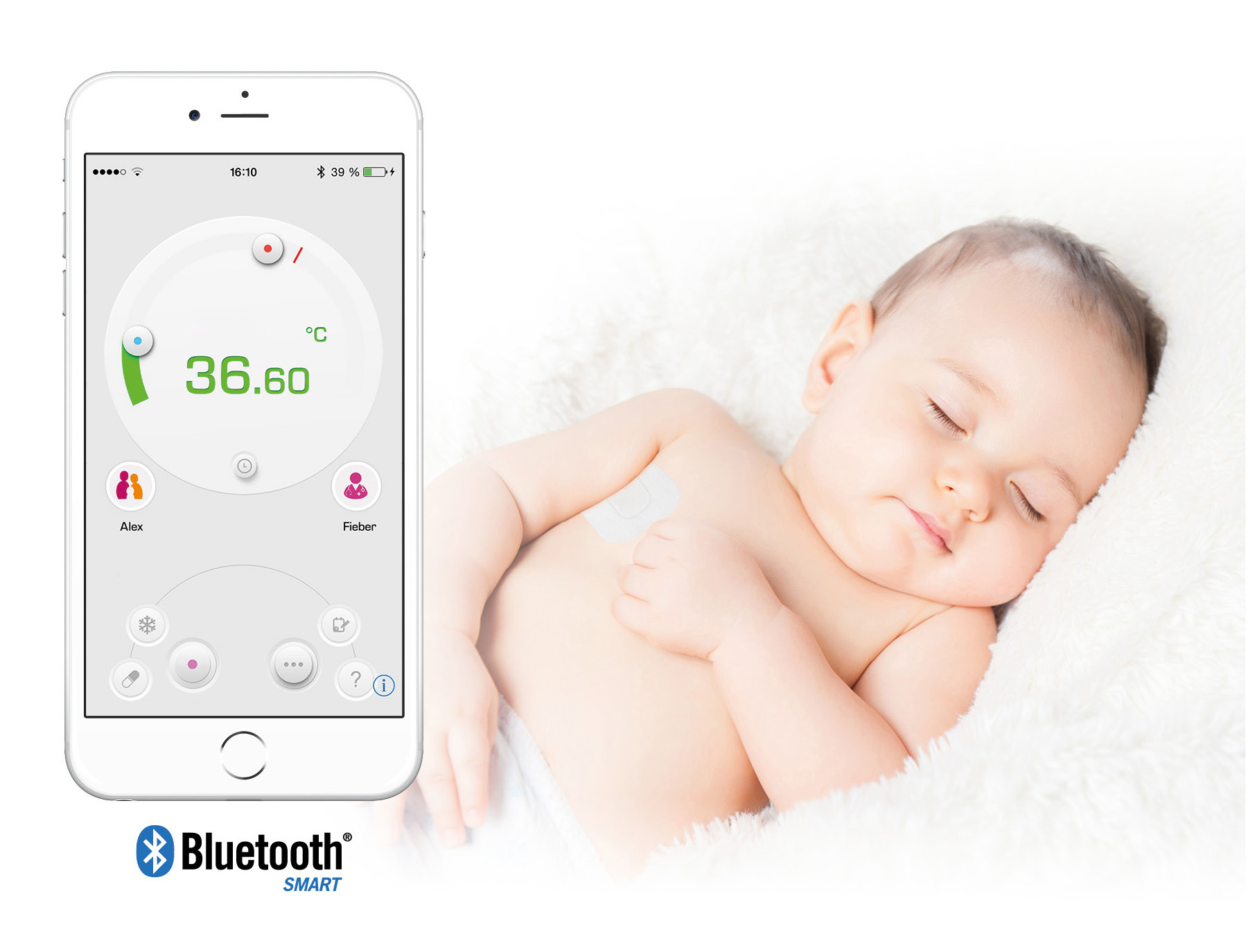 Der Verlauf der Werte kann somit fortwährend kontrolliert werden – ohne dauerhaft neu zu messen. Wird die in der App voreingestellte Temperaturzone überschritten, erfolgt automatisch ein Alarm, der auf die gestiegenen Werte hinweist. Eine Erinnerungsfunktion für die pünktliche Medikamenteneinnahme runden die Funktionen ab.