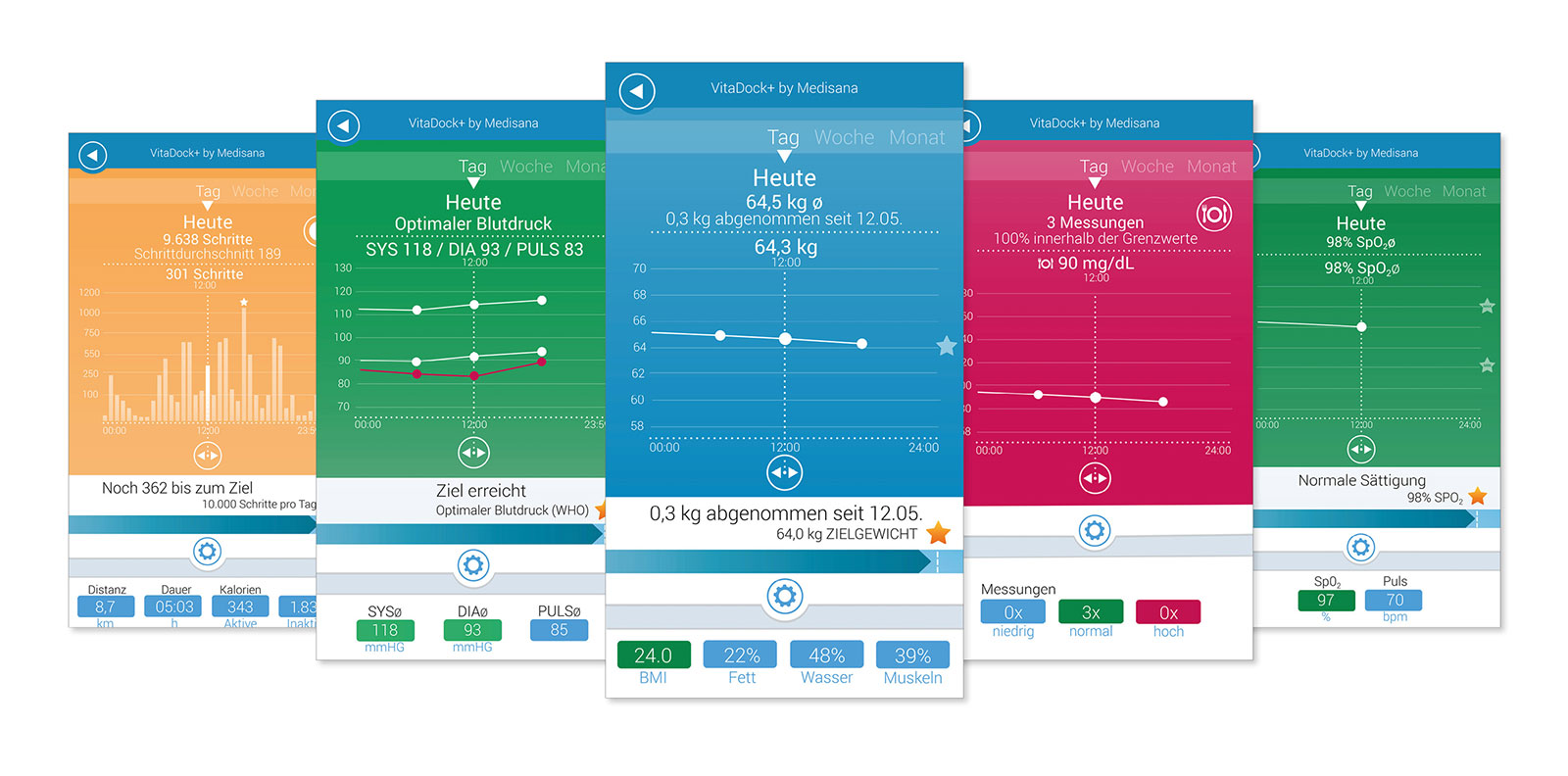Das App-Dashboard vereint tiefgehende Informationen mit übersichtlicher Struktur. Zusätzlich unterstützt eine einfache Ampel-Logik (rot, gelb, grün) eine schnelle Bewertung der Messungen. Das Dashboard zeichnet nun einen Verlaufsgraphen der letzten Messergebnisse, Wochen-, Monats- sowie Jahresgraphen und bietet kurze Text-Informationen zum jeweils letzten gemessenen Vitalwert und bewertet diese u.a. nach den Empfehlungen der WHO.
