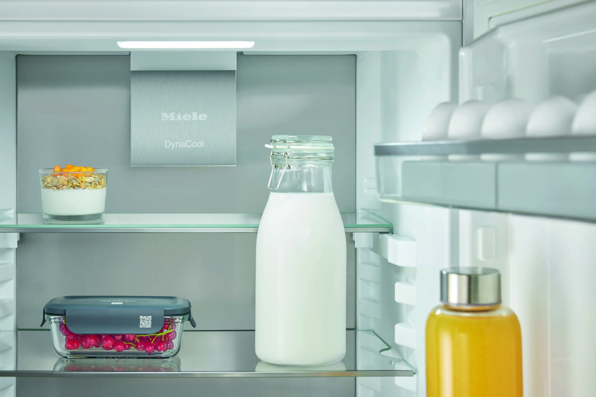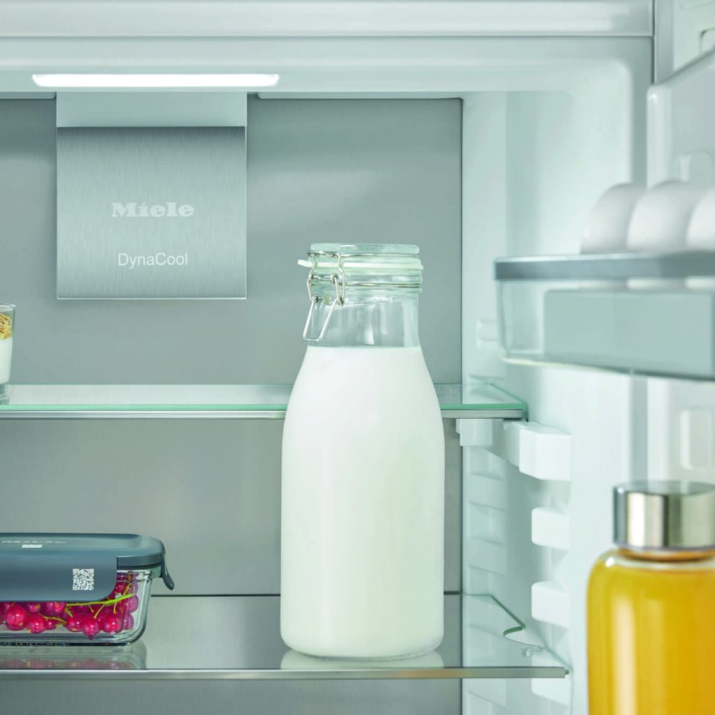 Funktionale Details wie das teilbare Flexiboard ermöglichen eine flexible Nutzung des Kühlraums. Durch das Verschieben der vorderen Glashälfte über die hintere lassen sich hohe Gefäße einstellen, ohne Stellfläche zu verlieren. Die untere Ebene ist zudem so gestaltet, dass ein komplettes Backblech darin Platz findet – eine Funktion, die Miele unter dem Namen Comfortsize führt.