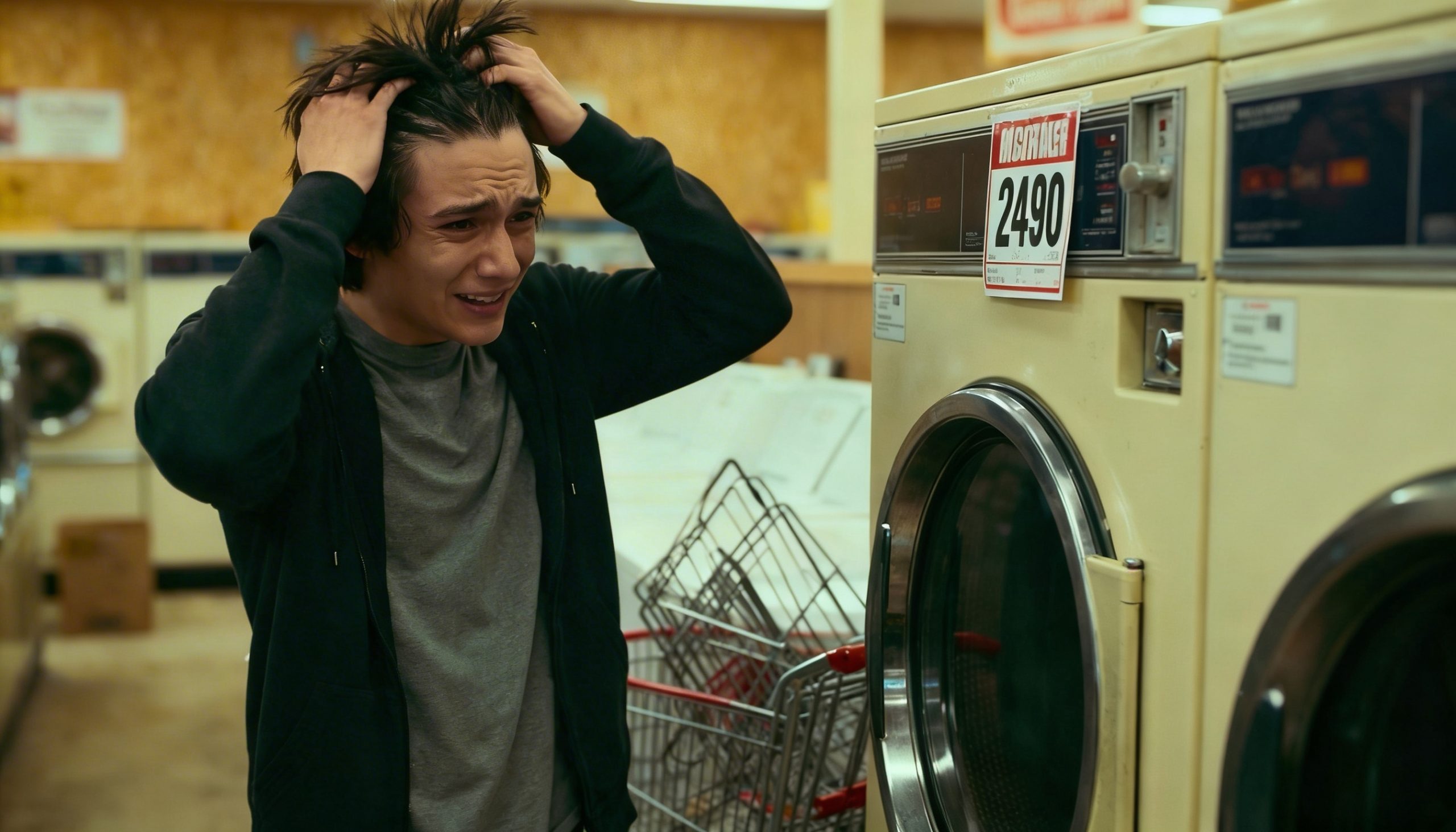Zum Haare raufen: Sicherlich wird niemand, wie auf dem KI-generierten Foto gezeigt, vor Verzweiflung vor einer Waschmaschine stehen, doch bereits die aktuelle Diskussion um eine Erhöhung der Mehrwertsteuer kann sich kontraproduktiv auf den Konsum auswirken. Foto: Mit KI generiert.