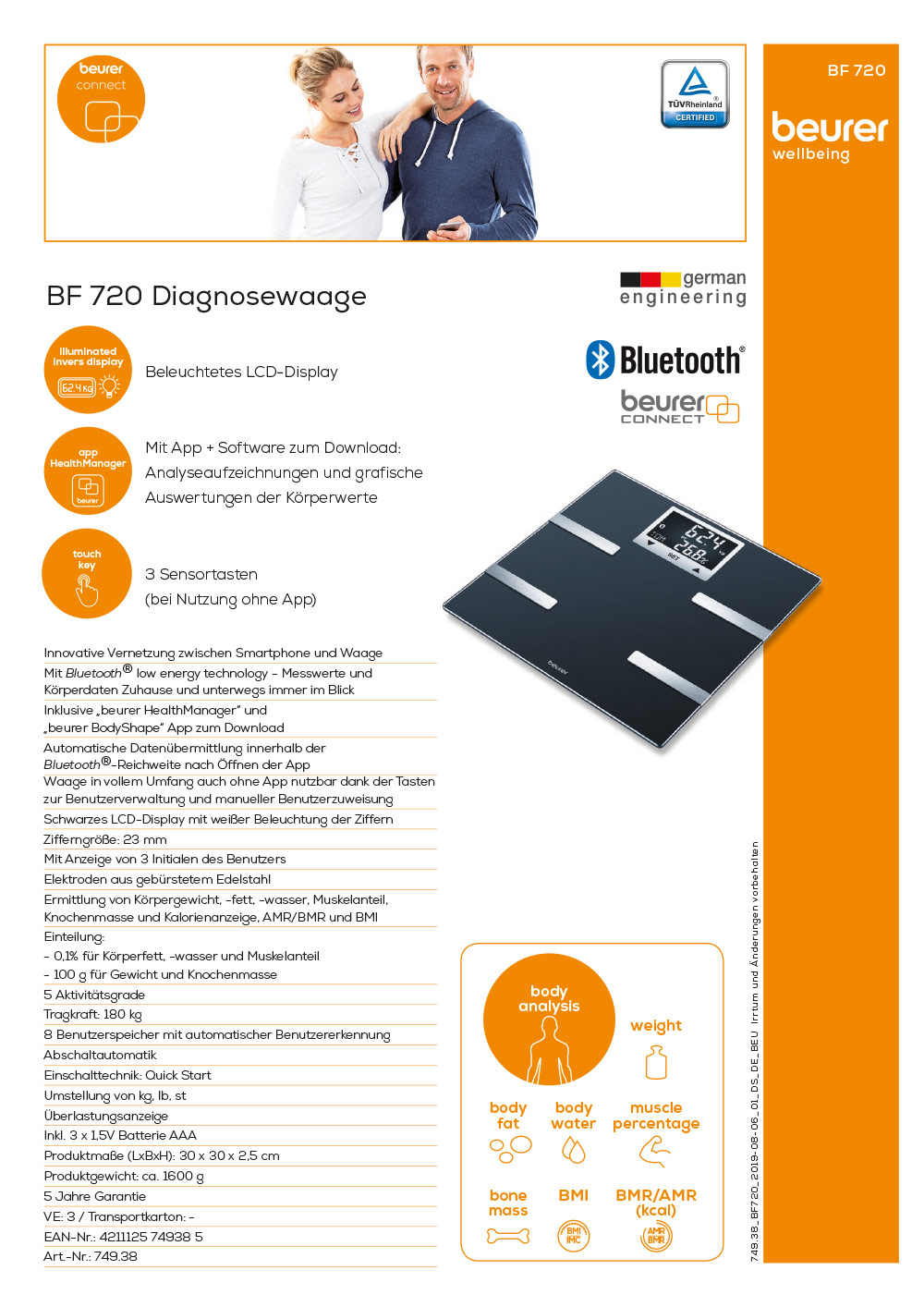 Die Waage verfügt über 5 Aktivitätsgrade, 8 Benutzerspeicherplätze mit automatischer Benutzererkennung und Anzeige von 3 Initialen sowie 30 Messwert-Speicherplätze. Mit einer Trittfläche aus stabilem Sicherheitsglas und einer Tragkraft bis 180 kg Körpergewicht ist das Produkt für die ganze Familie einsetzbar. Die Quickstart-Einschalttechnik und die Abschaltautomatik sind weitere nützliche Features. Die BF 720 überzeugt außerdem mit einem 3,7 Zoll großen und zweizeiligen schwarzen LCD-Display mit weißer Zifferbeleuchtung für besonders gute Lesbarkeit.