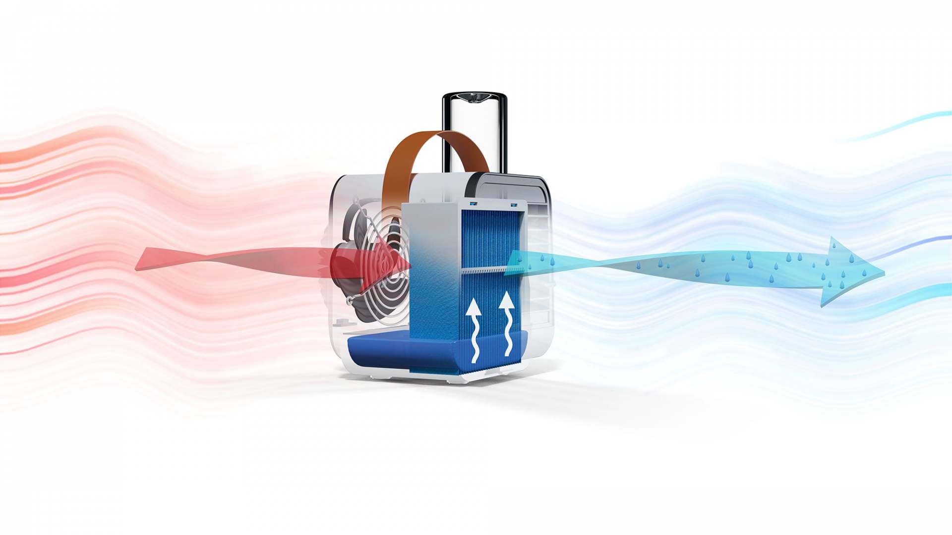 Wie funktioniert das Verdunstungsprinzip? Der Luftventilator saugt die trockene Warmluft des Raumes an, welche auf den mit Wasser vollgesaugten Verdunstungsfilter trifft. Durch den Kontakt zwischen Luftstrom und feuchter Filteroberfläche verdunstet das Wasser. Die Raumluft nimmt die Feuchtigkeit auf. Dabei wird dieser gleichzeitig die Wärmeenergie entzogen, die für die Verdunstung notwendig ist. Die fühlbare Temperatur der Raumluft sinkt. Der Wasserstand ist in der beigefügten Flasche immer sichtbar. Ohne Wasserflasche kann der LV 50 auch nur als Ventilator genutzt werden. Durch die austauschbare Flasche und wechselbaren Filter ist das Gerät besonders hygienisch.