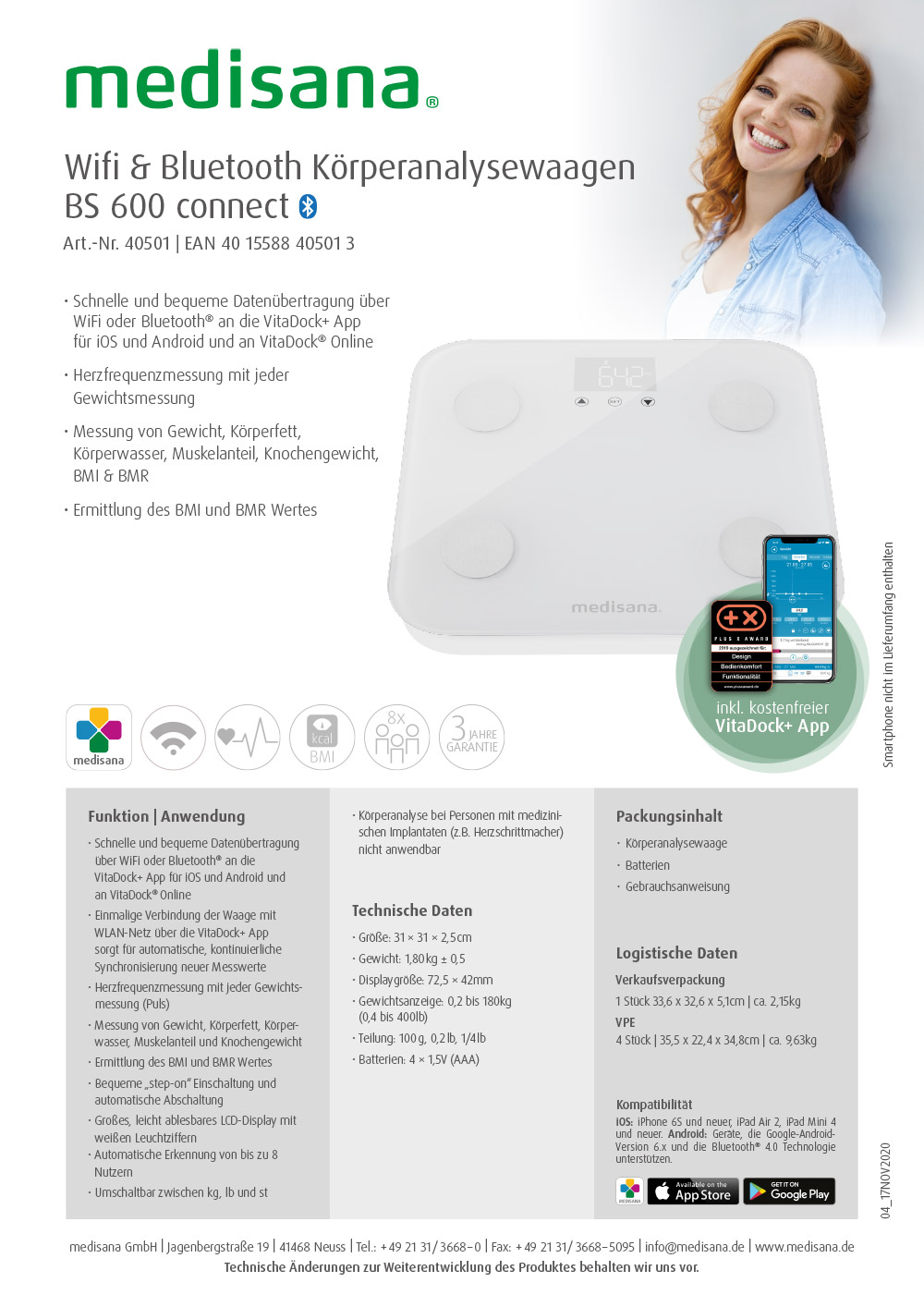 | Link zur Produktseite: | https://www.medisana.de/Gesundheitskontrolle/Personenwaagen/BS-600-connect-Wifi-Bluetooth-Koerperanalysewaage.html |