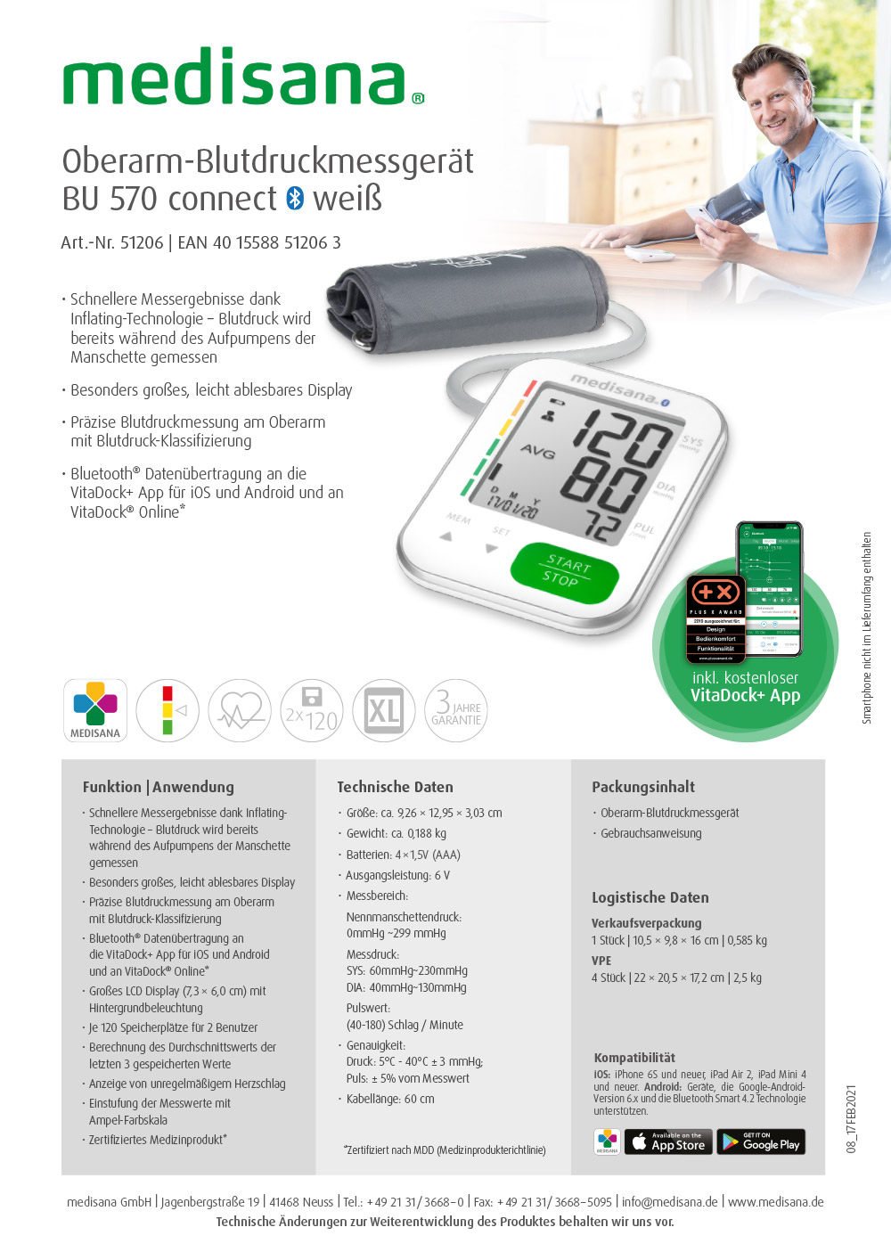 | Link zur Produktseite: | https://www.medisana.de/Gesundheitskontrolle/Blutdruckmessgeraete/BU-570-connect-Oberarm-Blutdruckmessgeraet.html |