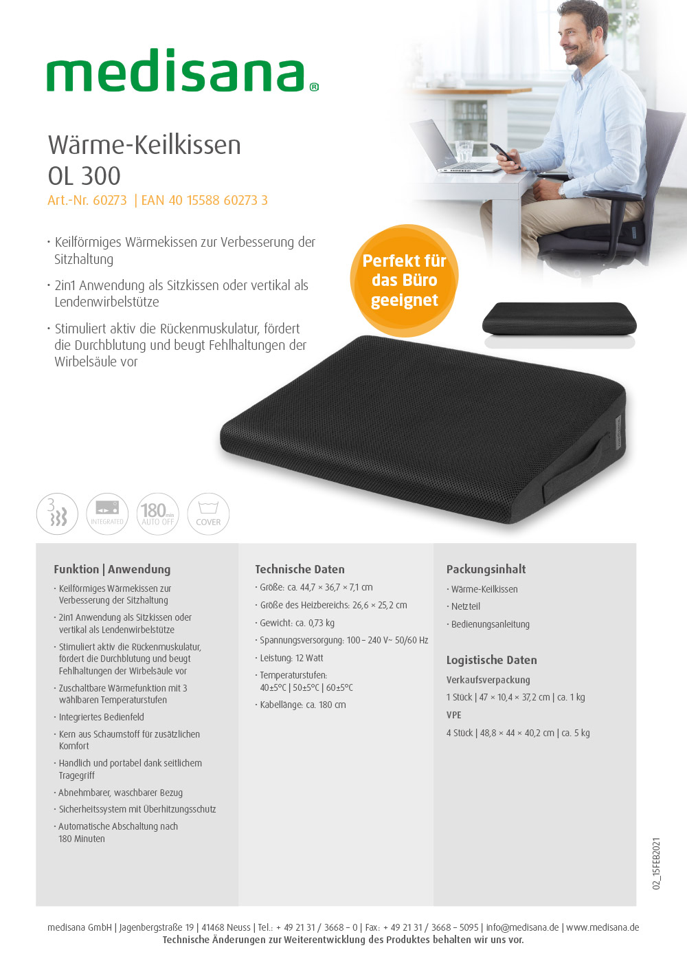 Unser aller Alltag spielt sich derzeit in großen Teilen digital vor dem PC ab. Zusätzlich bewegen wir uns mehrheitlich viel weniger als üblich und auch unsere Arbeitsplätze im Homeoffice sind meist wenig ergonomisch und komfortabel. Die beiden neuen Wärme-Keilkissen OL 300 & OL 350 der neuen “Office Line” von medisana nehmen sich diesem Umstand an und sorgen für mehr Ergonomie und einen gesunden Rücken im Büro und Homeoffice.