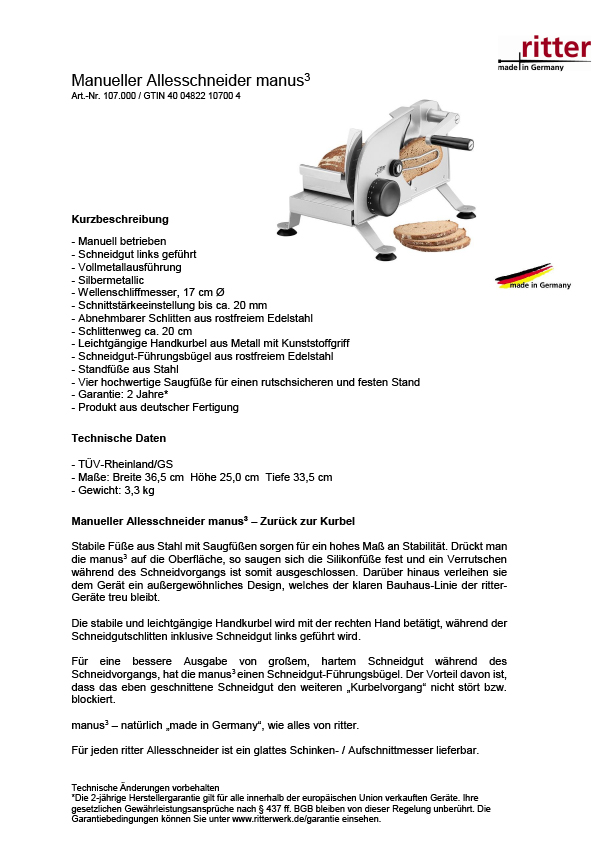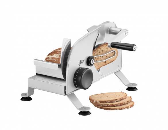 Eine zentrale Besonderheit des manuellen Allesschneiders manus 3 stellt sein freitragendes Design, komplett mit den vier Standfüßen aus hochwertigem Stahl, dar. Aber auch sein geringes Eigengewicht macht ihn zu einem rundum praktischen Gerät. Ein Verrutschen während des Schneidvorgangs ist dank der Silikonfüße ausgeschlossen, denn diese saugen sich auf der Oberfläche fest, sobald man die manus 3 etwas aufdrückt.